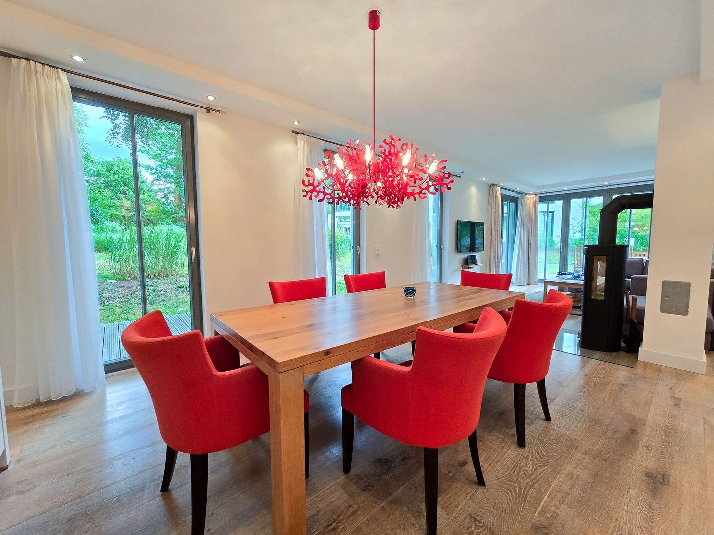 Diese komfortable Ferienwohnung bietet alles was das Herz begehrt und lädt Sie zu einem Frühstück auf Ihrer privaten Terrasse mit Strandkorb ein. Der großzügige Wohnraum verbindet das Wohnzimmer mit LCD-TV, Stereo-Anlage und Kaminofen mit dem Essbereich und einer voll ausgestatteten Küche. Hier finden sich ein Geschirrspüler, ein Backofen mit Cerankochfeld, eine Mikrowelle, ein Toaster, ein Wasserkocher und eine Kaffeemaschine. Beide Schlafzimmer verfügen über gemütliche Doppelbetten, einen LCD-Fernseher sowie ein eigenes Badezimmer. Zusätzlich gibt es ein Gäste-WC und eine Waschmaschine sowie einen Trockner im Keller. Die ganze Wohnung hat Fußbodenheizung und ein Tiefgaragenstellplatz ist inklusive.