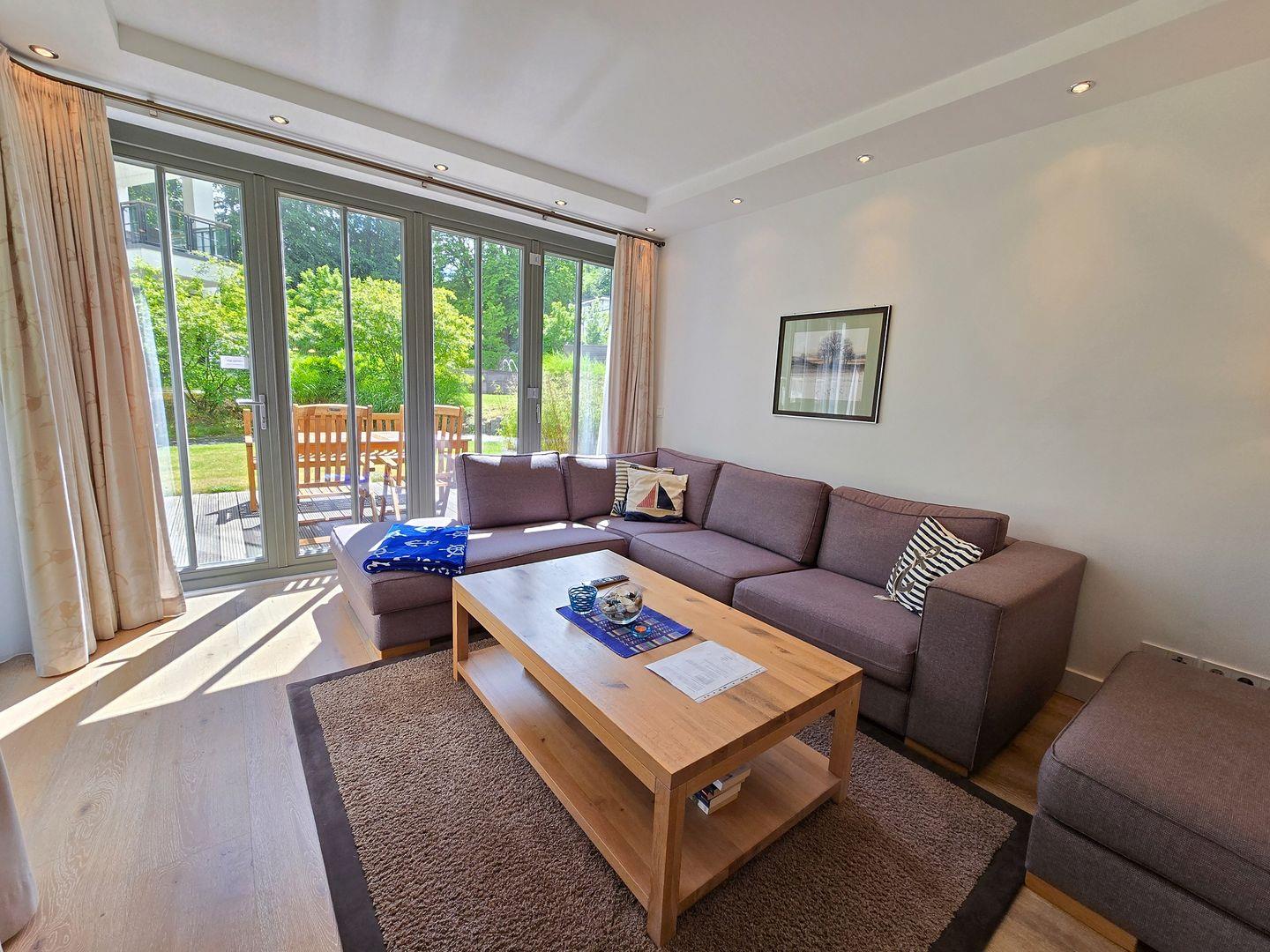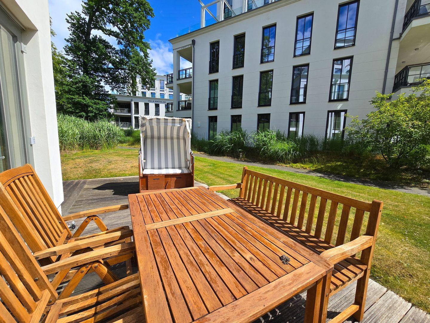 Parkvilla Amalie; Wohnzimmer mit Kaminofen, Terrasse mit Strandkorb, LCD-TV, Stereo-Anlage, eingerichtete Küchenzeile mit Geschirrspüler, Mikrowelle und Backofen, Cerankochfeld, 2 Schlafzimmer mit Doppelbett und LCD-Fernseher, davon eines mit Bad und Dusche/ WC, eines mit Bad und Dusche, zusätzliches Gäste-WC, Haustiere nicht erlaubt, Nichtraucher, Fußbodenheizung in der gesamten Wohnung, max. Belegung 4 Erwachsene, inkl. Tiefgaragenstellplatz (max. Höhe 2,05 m), eigene Waschmaschine und Trockner im Keller, kostenfreier W-LAN-Anschluss
