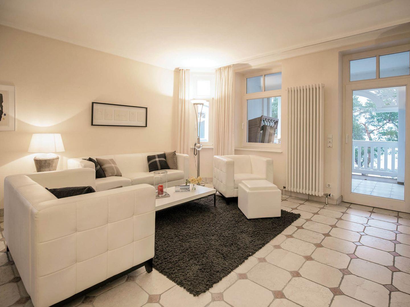 Villa Seeadler; Wohnzimmer, Schlafzimmer mit Doppelbett, Wohnküche mit Geschirrspüler, Mikrowelle, 4-Platten-Herd, Dusche/ WC, Gäste-WC mit Waschmaschine, 2 seeseitige Balkone, HiFi-Anlage, 2 Fernseher (1x LCD-TV), DVD-Player, Wohnung über 2 Etagen, keine Haustiere erlaubt, Nichtraucher, kostenfreier WLAN- und DSL-Anschluss, Belegung mit max. 4 Personen, Juni bis September mindestens 7 Übernachtungen, von Mai bis September eigener Strandkorb am Strand gegen Aufpreis buchbar
