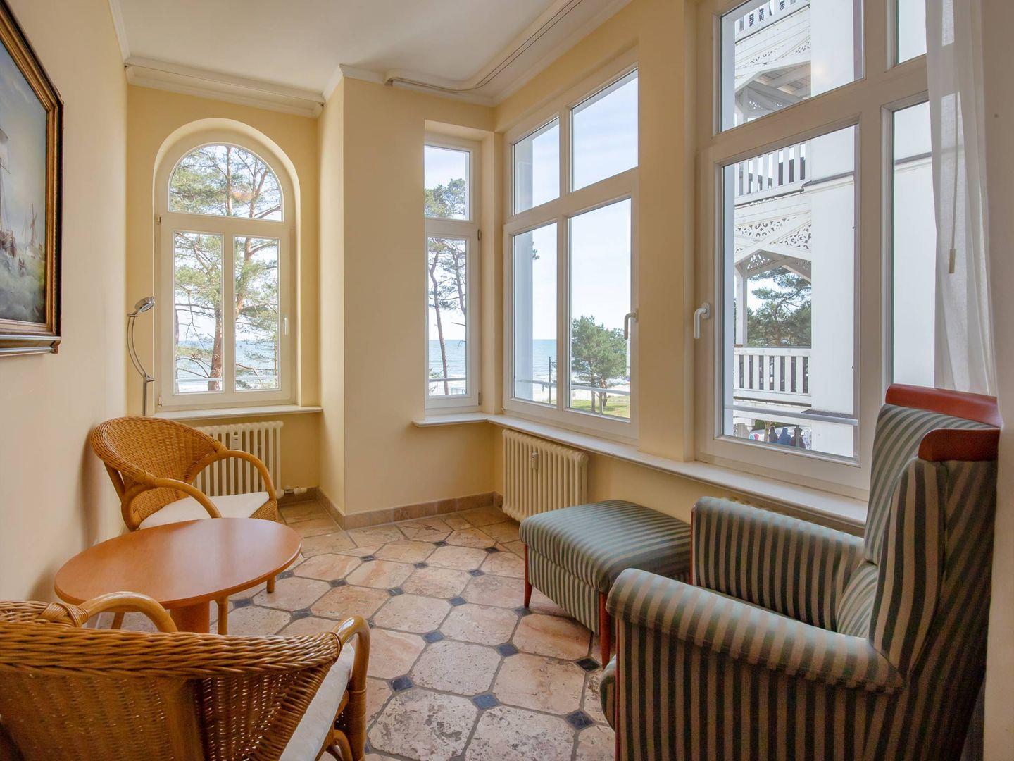Die Besonderheit dieser hübschen Ferienwohnung ist ein separates seeseitiges Erkerzimmer. Der Wohnraum verbindet das Wohnzimmer mit einem Essbereich und einer gut ausgestatteten Küche. Vorhanden sind hier ein 4-Plattenherd, ein Backofen, ein Geschirrspüler, eine Mikrowelle, eine Kaffeemaschine, ein Wasserkocher und ein Toaster. Das Wohnzimmer punktet neben einem Schlafsofa auch mit einem LCD-TV, einem Blu-Ray-Player und einer Stereo-Anlage. Im Schlafzimmer steht ein Doppelbett, ein angrenzendes Ankleidezimmer bietet ausreichend Stauraum. Das Badezimmer überzeugt mit einer geräumigen Dusche, einem Waschbecken, einem WC und einem großen Spiegel. Haustiere sind in dieser Wohnung herzlich willkommen. In der Zeit von Mai bis September ist ein eigener Strandkorb am Strand kostenfrei nutzbar.