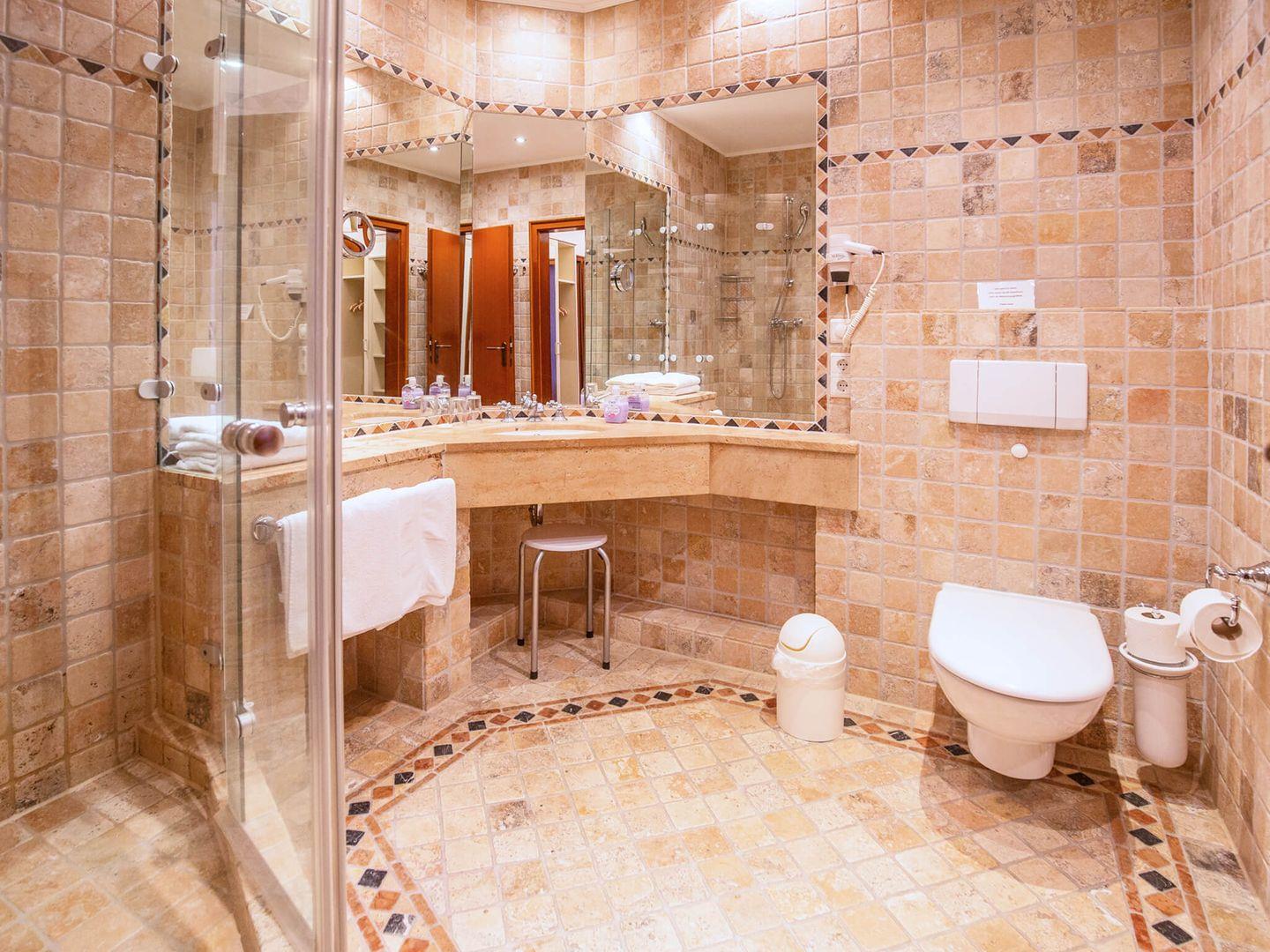 Im Badezimmer erwarten Sie eine eigene Sauna, eine geräumige Dusche sowie ein Waschbecken, Haartrockner, WC und große Spiegel.