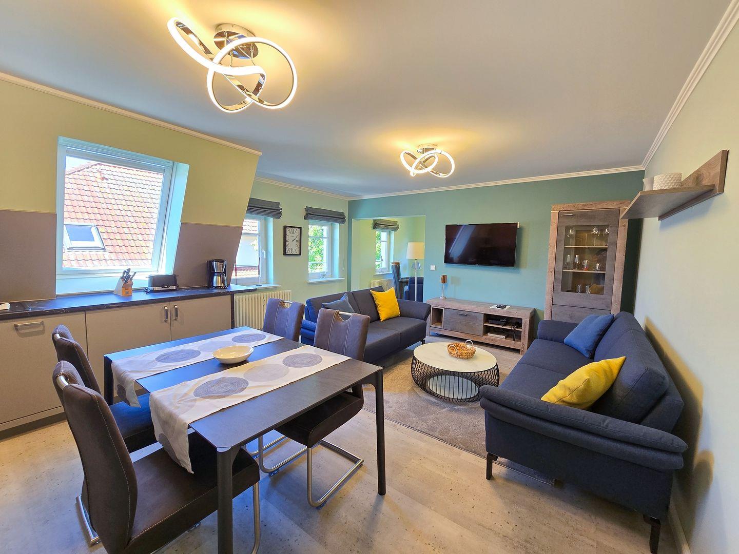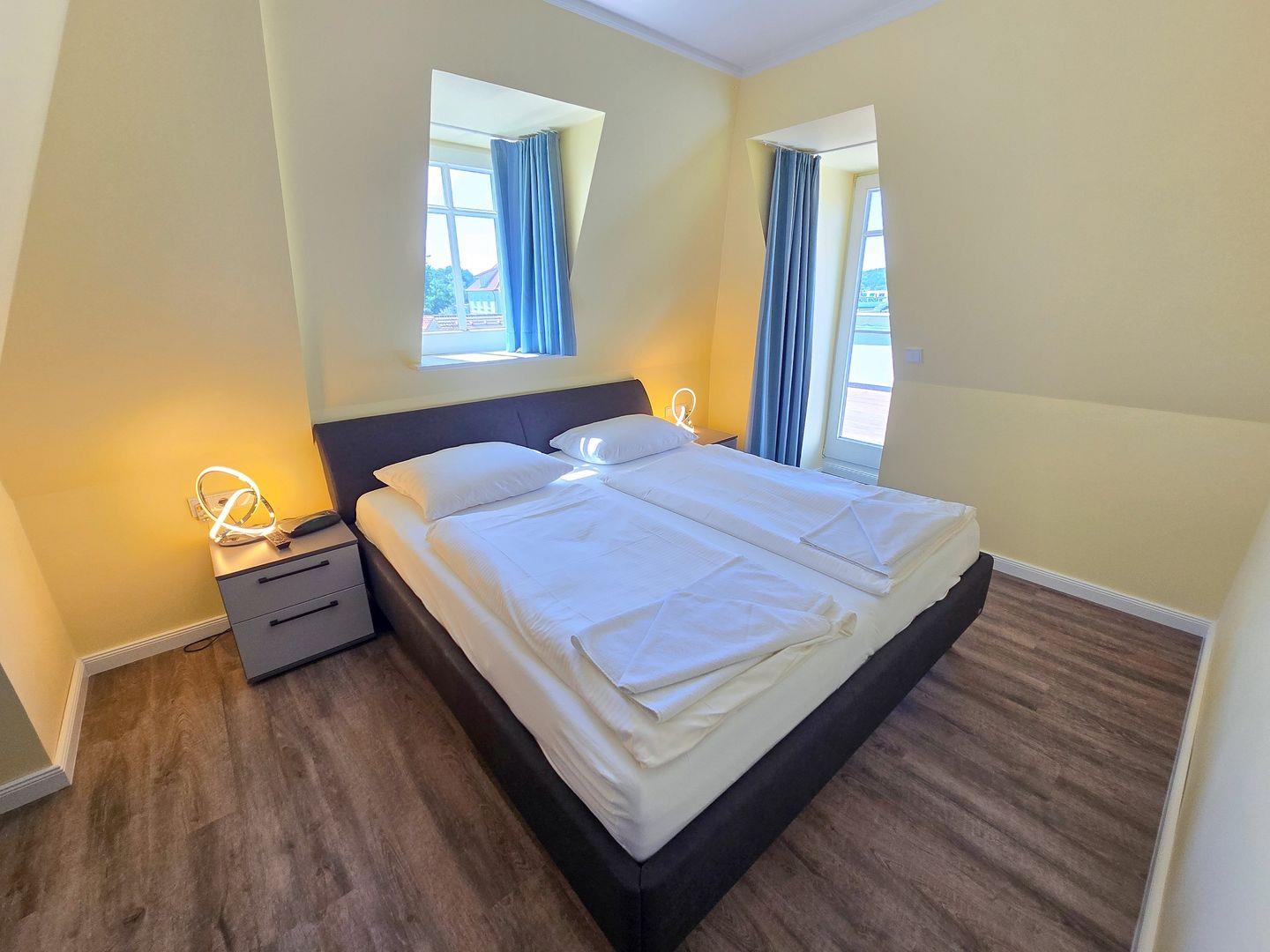 Villa Elfeld; Wohnzimmer, seeseitiges Erkerzimmer, 2 Schlafzimmer (1 x Doppelbett, 2 x Einzelbetten (0,90*2,00) Dachterrasse mit Panoramablick und eingeschränktem Seeblick, eingerichtete Küchenzeile mit 4-Platten-Cerankochfeld, Backofen, Geschirrspüler und Mikrowelle, Kaffeemaschine, Espressomaschine, Dusche/WC, LCD-Fernseher, DVD-Player, Stereo-Anlage, Haustiere nicht erlaubt, Nichtraucher, kostenfreier WLAN-Anschluss, max. Belegung mit 4 Personen