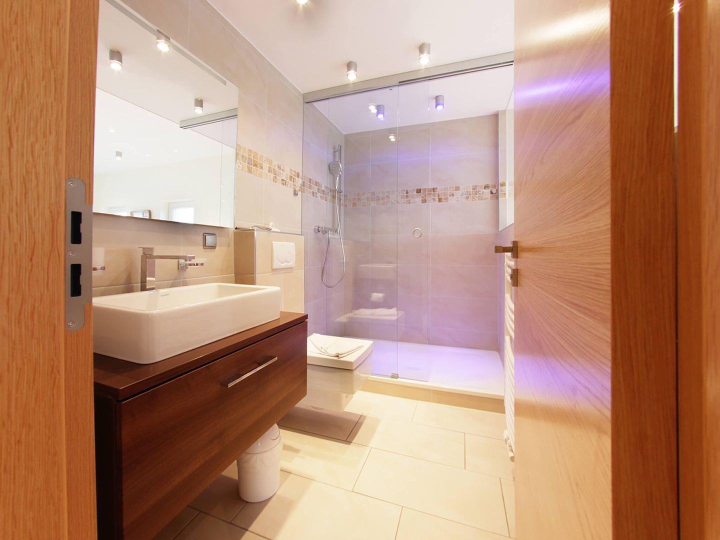 Villa Seestern; optisch getrennter Wohn- und Schlafbereich mit seeseitigem Balkon, eingerichtete Küchenzeile mit 4-Platten-Herd, Geschirrspüler und Mikrowelle, LCD-Flachbildschirm (mit 3D, DVD-Player), Micro HI-FI Component System (mit CD, MP3, USB), 2. Schlafraum im ausgebauten Turmzimmer mit LCD-Flachbildschirm, 2 Bäder mit Dusche/WC, Nichtraucher, Haustiere nicht erlaubt, kostenfreier WLAN-Anschluss, Belegung mit max. 4 Personen, eigener Strandkorb (Mai - September) kostenfrei nutzbar