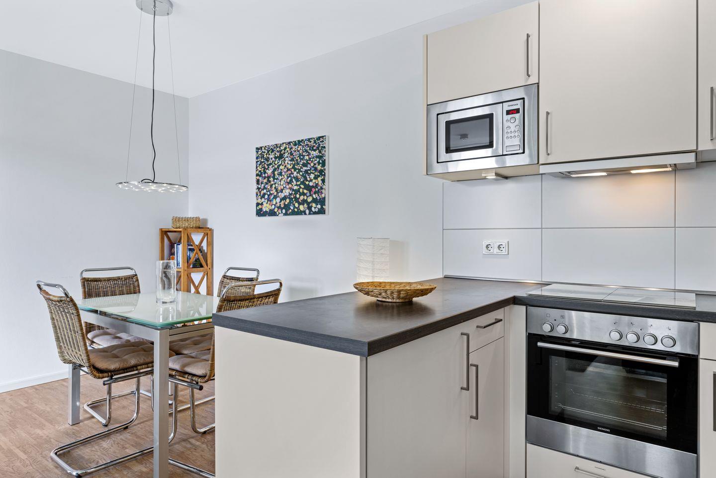 Das Apartment verfügt über eine voll ausgestattete offene Küche mit Wasserkocher, Kaffeemaschine, Toaster, Backofen, Mikrowelle, Geschirrspüler Kühlschrank mit Tiefkühlfach.