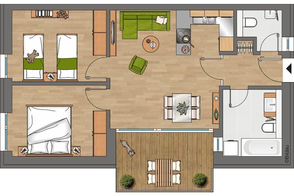 Das moderne Nichtraucher-Apartment mit kostenfreiem WLAN besteht aus zwei Schlafzimmern mit Doppelbett bzw. zwei Einzelbetten, einem Wohnbereich mit TV-HiFi-Anlage und angrenzendem, großzügigen Balkon und einem hochwertigen Bad mit Whirlbadewanne, Föhn, Waschmaschine und Dusche sowie einem weiteren separaten WC.