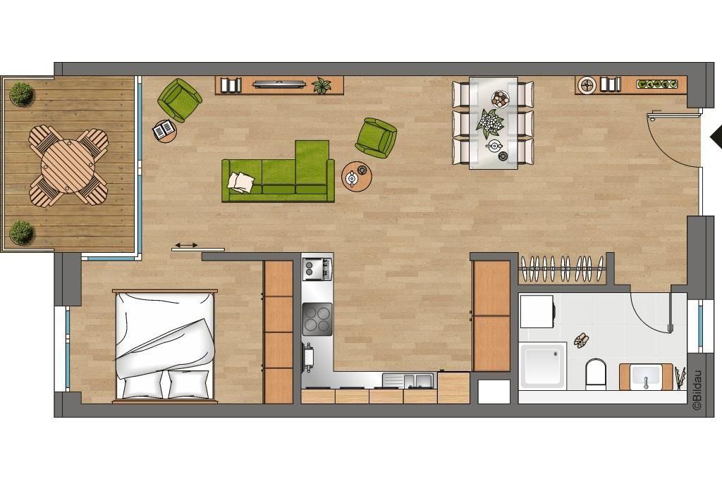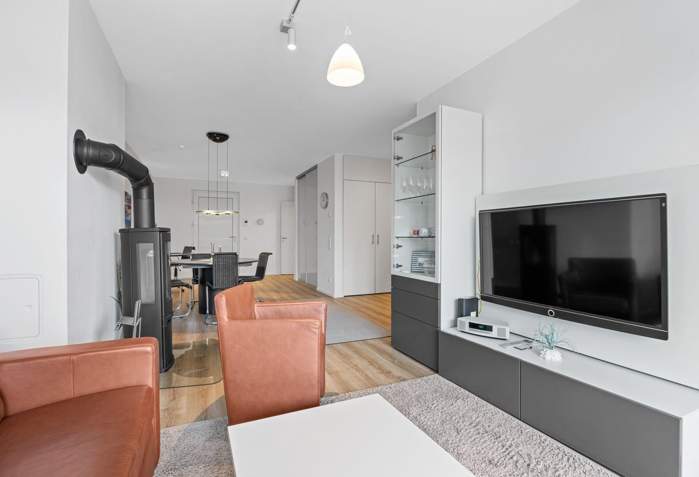 Das geschmackvoll eingerichtete Apartment mit kostenfreiem WLAN verfügt über Fußbodenheizung, ein Schlafzimmer mit Doppelbett und Flatscreen-TV (32 Zoll), einen Wohnbereich mit Schlafcouch (1,60 m x 2,00 m), Kaminofen (Kaminholz ist nicht inbegriffen) und Balkon sowie über ein modernes Bad mit bodengleicher Dusche, Waschmaschine, Föhn, Kosmetikspiegel, WC und Urinal.