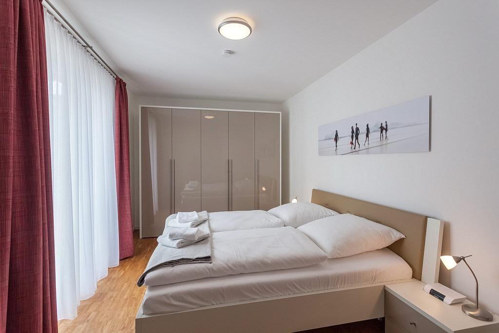 Zum Nichtraucher-Apartment der gehobenen Ausstattung gehören kostenfreies WLAN, ein Schlafzimmer mit Doppelbett, ein Wohnbereich mit Doppelschlafcouch (1,40 x 1,90 m) und angrenzendem Südwestbalkon und Bad mit Dusche.