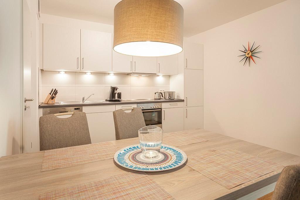 Das allergikerfreundliche Nichtraucher-Apartment mit Kaminofen (Kaminholz ist nicht inbegriffen) und Fußbodenheizung besteht aus einem Schlafzimmer mit Doppelbett (1,80 m x 2,00 m) sowie Flatscreen-TV, einem Wohnbereich mit Doppelschlafcouch (1,15 m x 2,00 m), HiFi-Anlage, einem Flatscreen-TV sowie einer ebenerdigen Terrasse in Südlage. Eine voll ausgestattete offene Küche mit Wasserkocher, Senseo-Kaffeemaschine, Toaster, Backofen, Geschirrspüler, Tiefkühlfach, ein Bad mit Dusche sowie Waschmaschine, Föhn und Kosmetikspiegel lassen keine Wünsche offen. Ein Kinderbett kann gegen Entgelt im Schlafzimmer aufgestellt werden und auf Wunsch könnt ihr einen Hochstuhl hinzubuchen.
