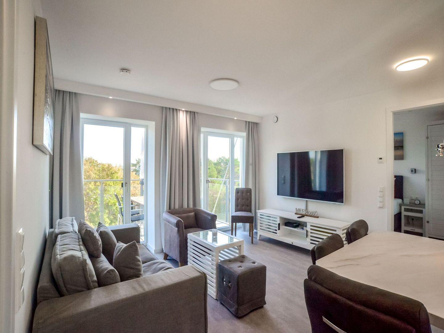 Dünenresidenz Neues Prora, Block 3, Wohnzimmer mit LCD-TV, seeseitiger Balkon, eingerichtete Küchenzeile mit Geschirrspüler und Backofen, 2 Schlafzimmer mit Doppelbett und Fernseher, zwei Bäder mit Dusche, eigene Infrarotsauna, kostenfreier WLAN-Anschluss, Haustiere nicht erlaubt, Nichtraucher, 2 PKW-Stellplätze (gegen Gebühr), max. 4 Personen