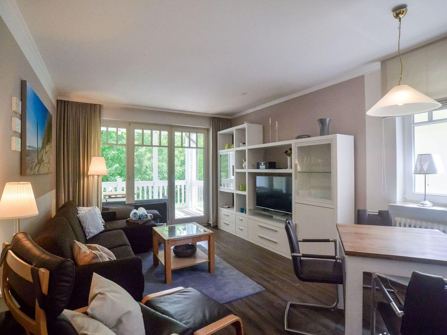 Diese komfortable Ferienwohnung bietet alles was das Herz begehrt und lädt Sie zu einem Frühstück auf Ihrem privaten Balkon ein. Zudem liegt die Wohnung sehr ruhig am Waldrand, vom Balkon aus hören Sie das Rauschen der Ostsee durch die Bäume. Der Wohnraum verbindet ein gemütliches Wohnzimmer, inklusive eines ausziehbaren Schlafsofas, mit einem Essbereich und einer voll ausgestatteten Küche. Vorhanden sind ein Geschirrspüler, ein Backofen mit Kochfeld, sowie ein Wasserkocher, eine Kaffeemaschine und ein Toaster. Das Wohnzimmer überzeugt mit einem LCD-Flachbildschirm und einer Stereo-Anlage. Das Schlafzimmer ist mit einem Doppelbett eingerichtet und bietet genügend Verstaumöglichkeiten für Ihre Kleidung. Im Badezimmer erwarten Sie eine geräumige Dusche, ein Waschbecken, ein WC sowie ein großer Ganzkörperspiegel. Haustiere sind in dieser Wohnung nicht erlaubt.