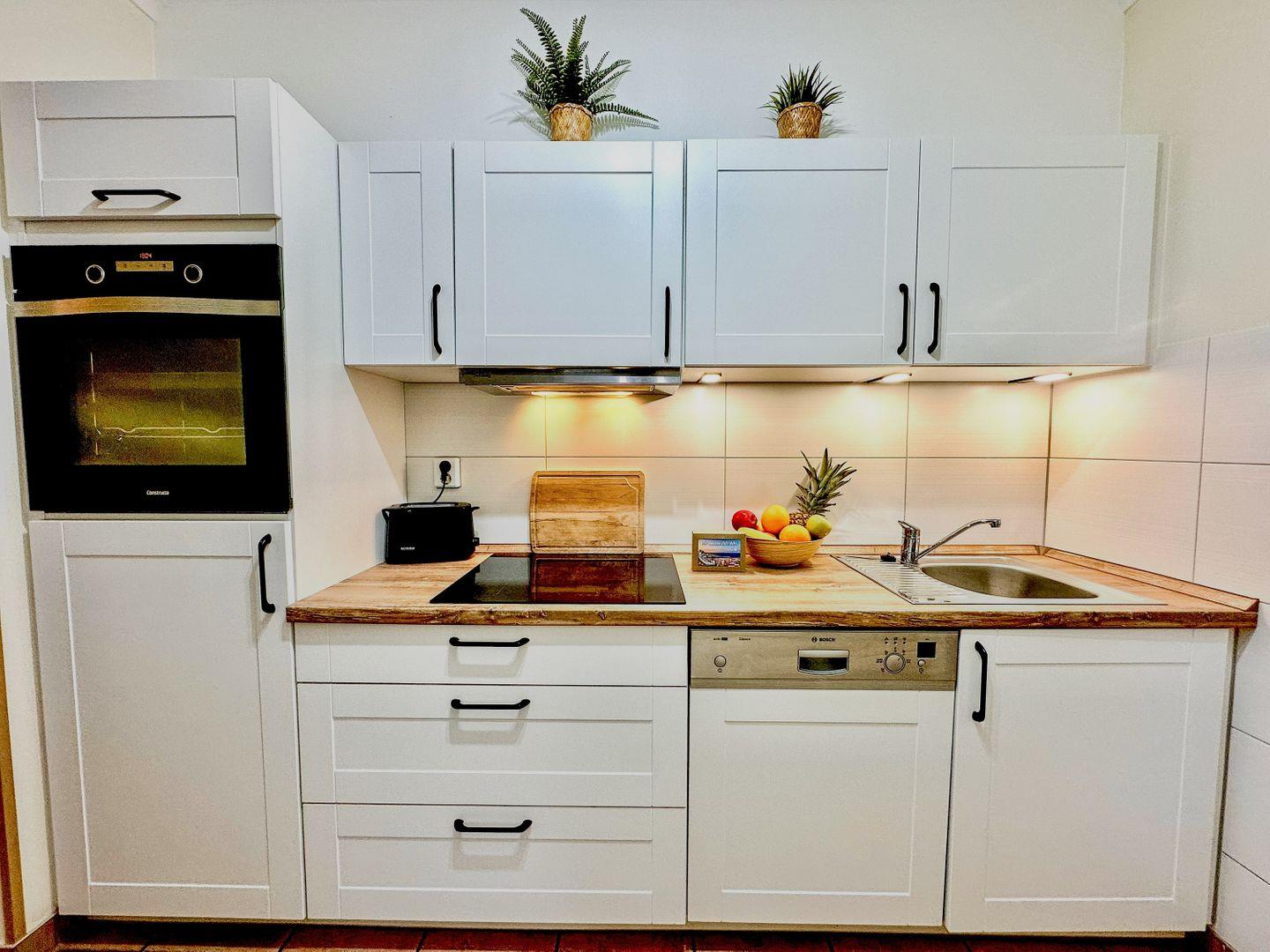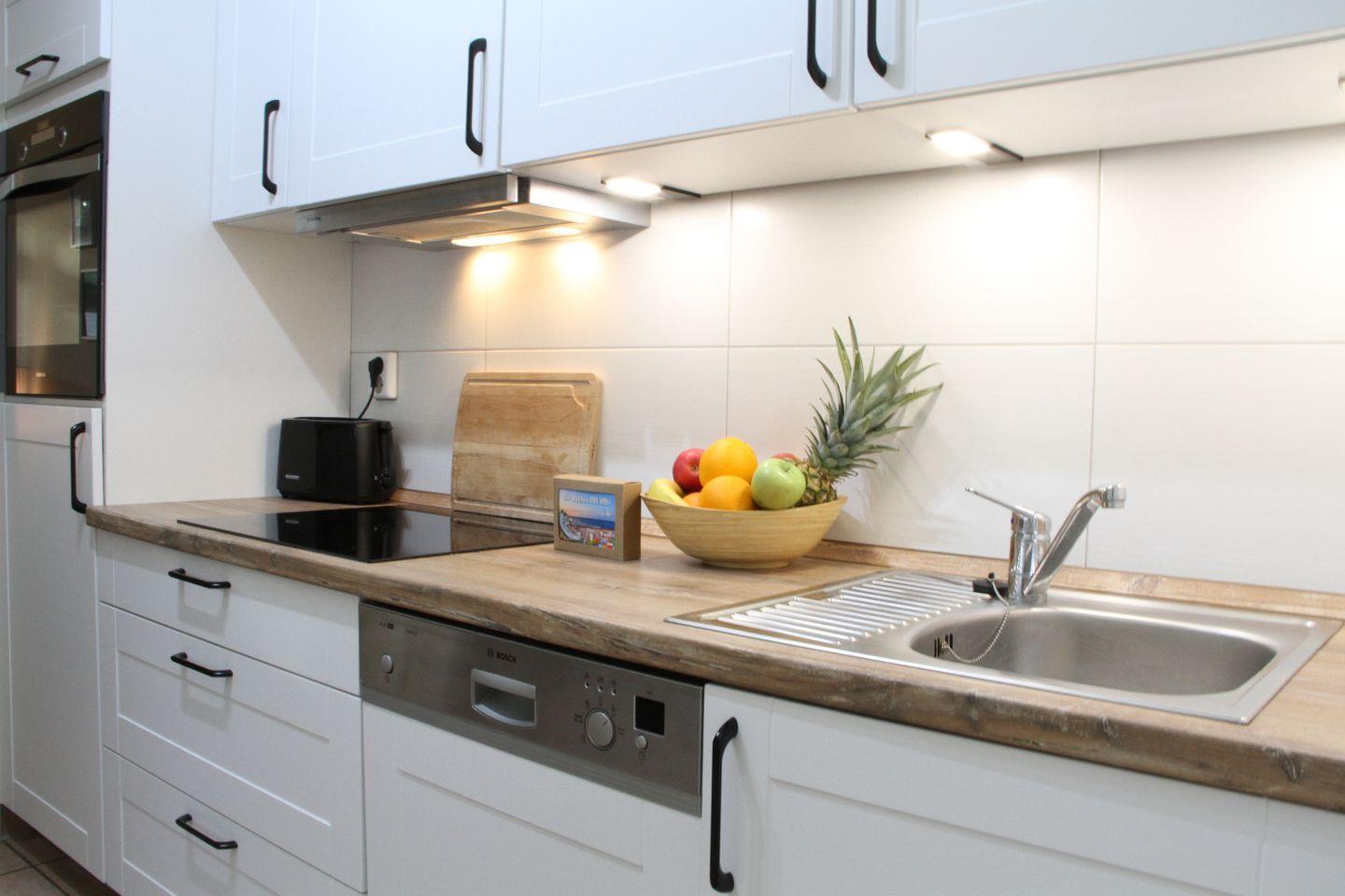 KÜCHE // Offene Küche, 4-Platten Cerankochfeld, Backofen, Kühlschrank, Toaster, Wasserkocher, Kaffeemaschine, Geschirrspüler, reichlich Besteck, Geschirr und Küchenutensilien ++