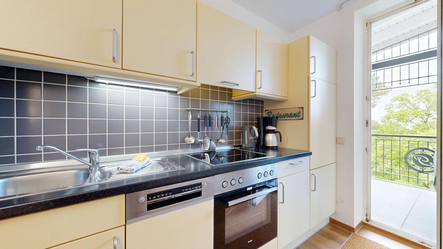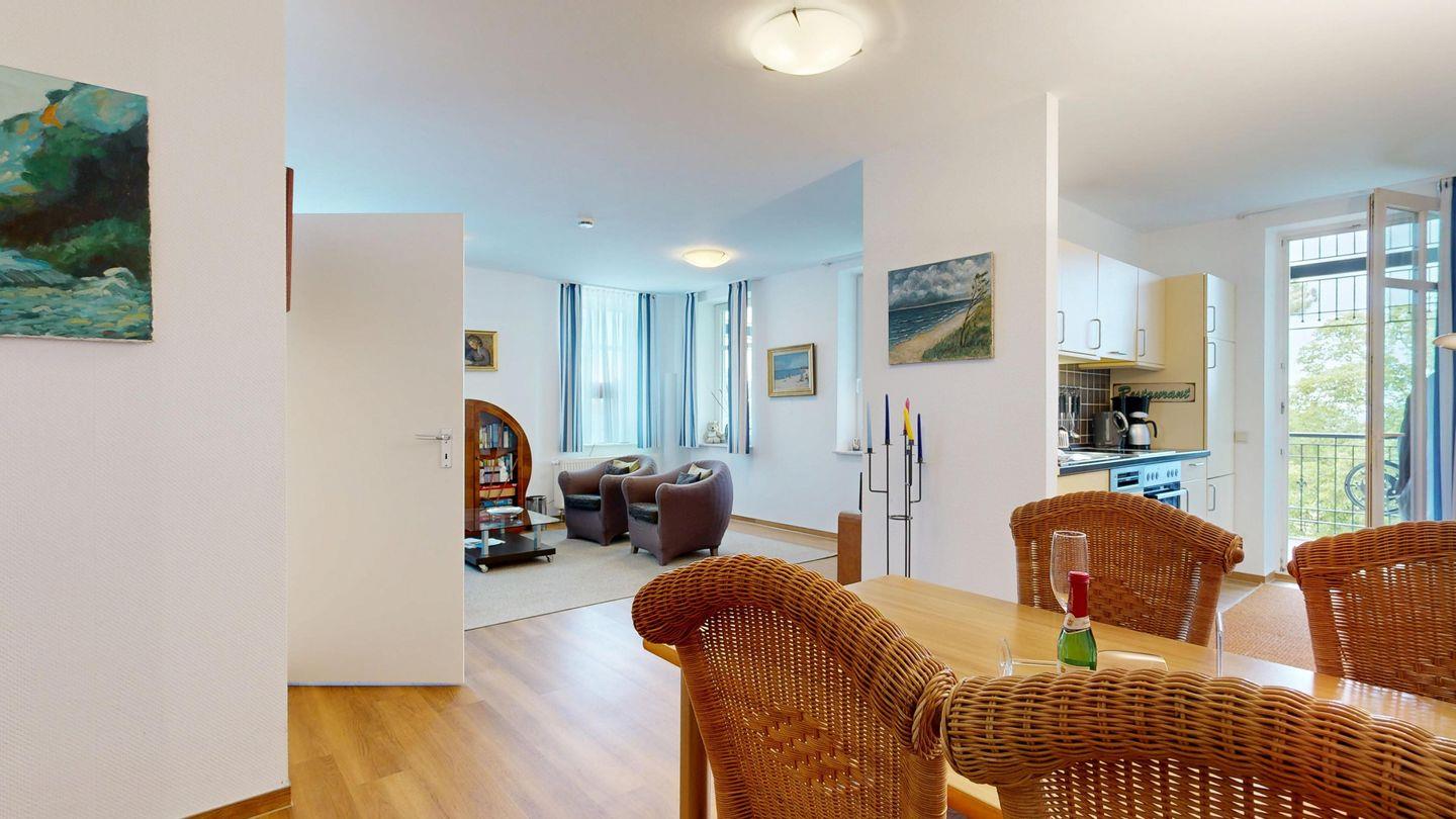 Ein großzügiger Balkon schenkt Ihnen einen spektakulären Panoramablick auf Ostsee, Strand, Seebrücke und im Hintergrund die majestätischen Kreidefelsen – ein echtes Highlight! Die moderne, räumlich abgetrennte Küchenzeile inklusive Spülmaschine macht Sie unabhängig, während das Wohnambiente pure Urlaubsvibes versprüht. Auf dem Balkon steht ein Strandkorb,