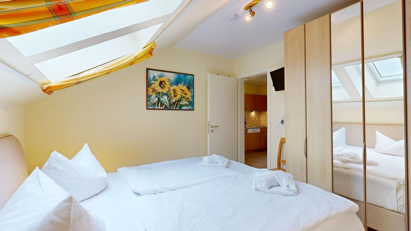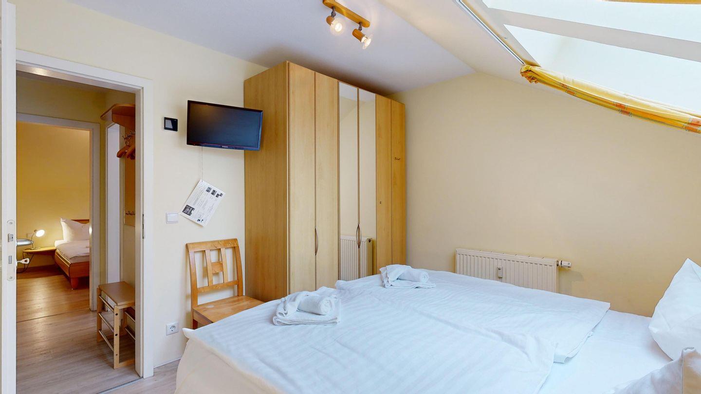 * 1 Schlafzimmer mit einem hochwertigem Boxspringbett, Kleiderschrank und zusätzlichem TV, Verdunklung durch Außenrollo möglich