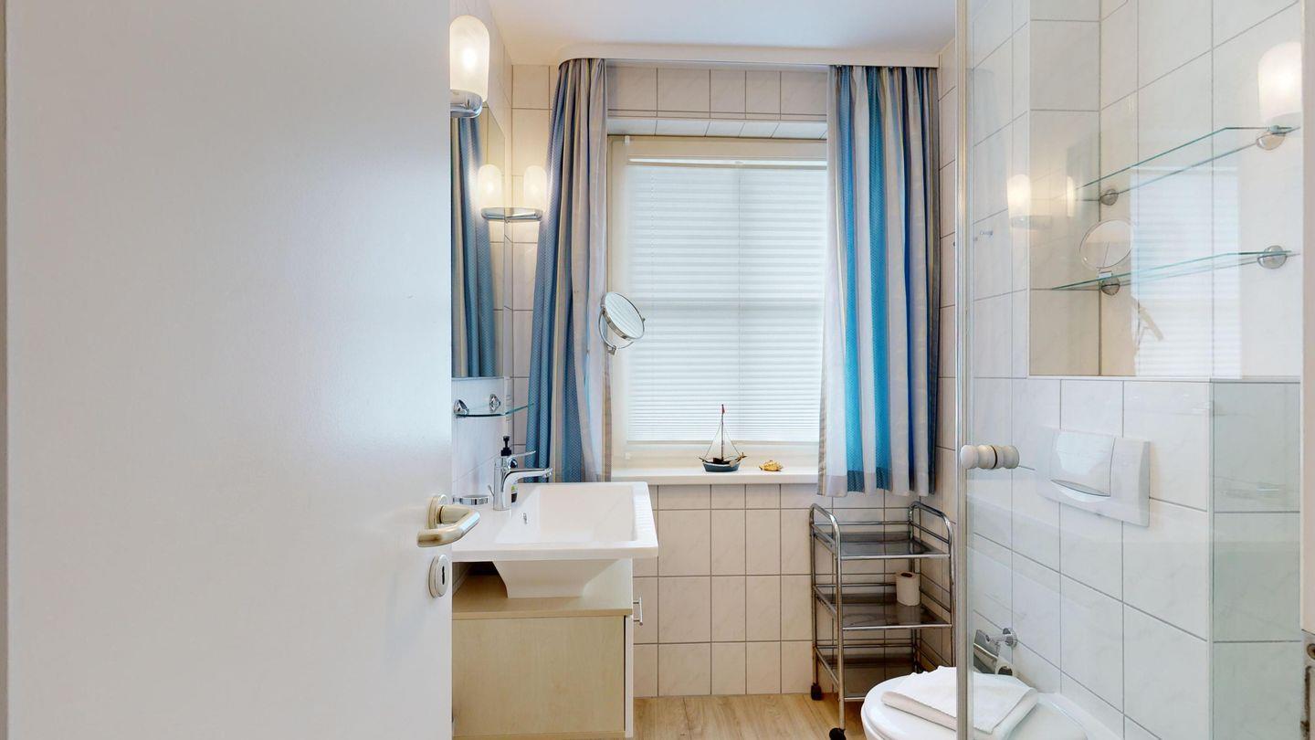 * Badezimmer mit Dusche, WC, Föhn, Kosmetikspiegel, Fußbodenheizung und Außenfenster