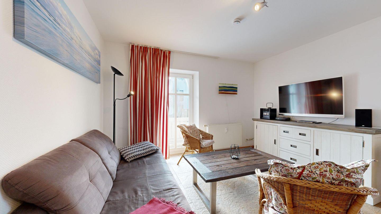 * Wohnzimmer: Couchgarnitur, Smart-TV, großer Esstisch mit Stühlen, WLAN-Internetanschluss, diverse Gesellschaftsspiele, kleine Bibliothek