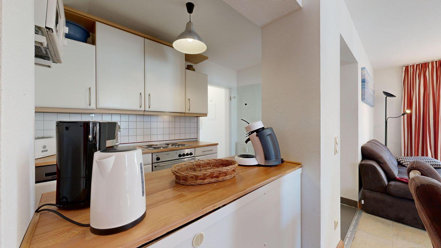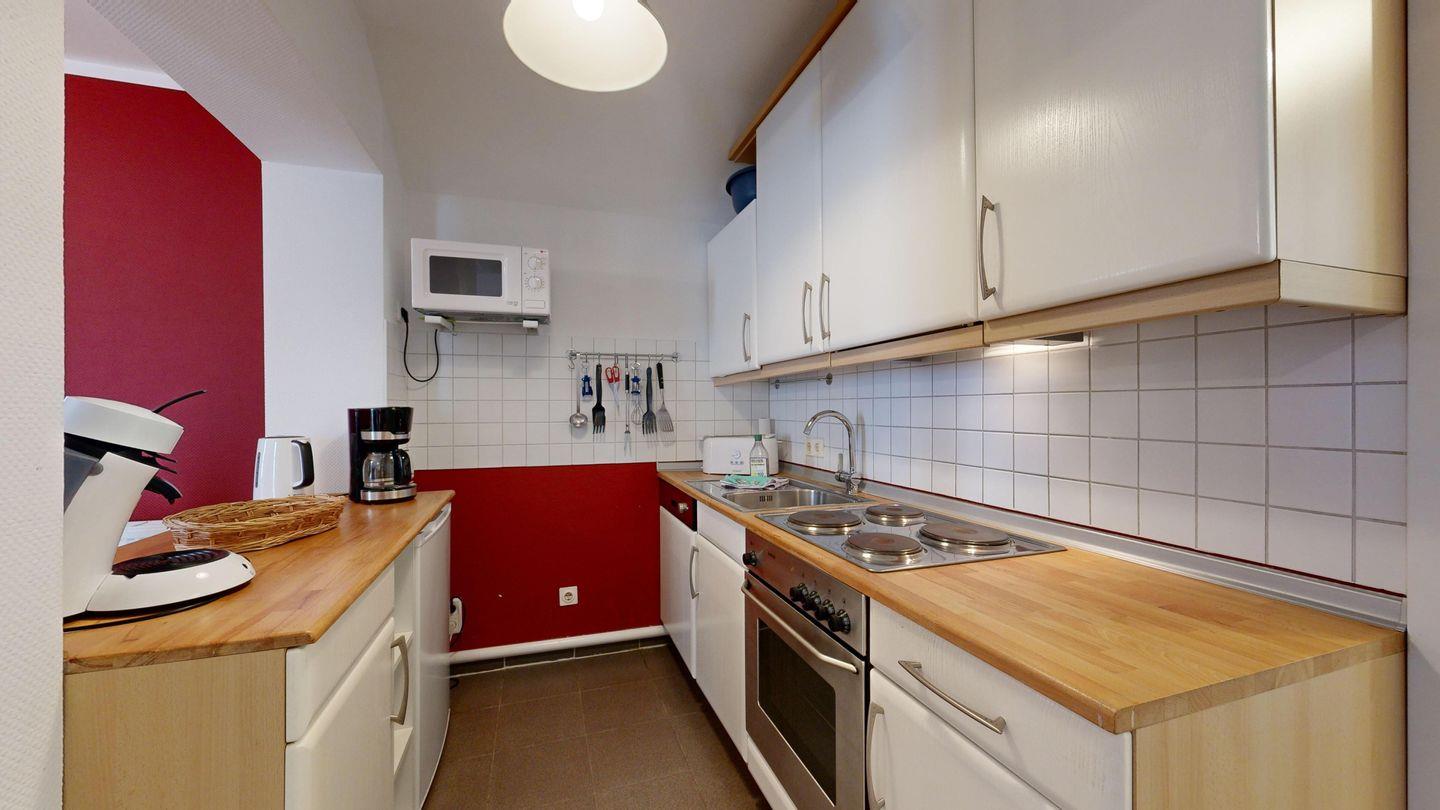 * Küchenzeile: E-Herd mit Backofen, Spülmaschine, Mikrowelle, Kühlschrank mit Gefrierfach, Wasserkocher, Kaffeemaschine und Toaster