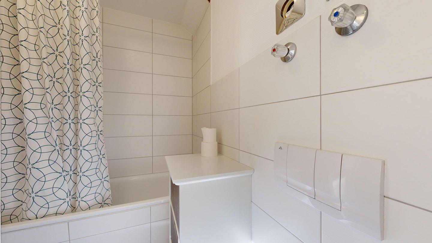 * 1 Badezimmer mit Waschbecken, Badewanne, WC und Föhn