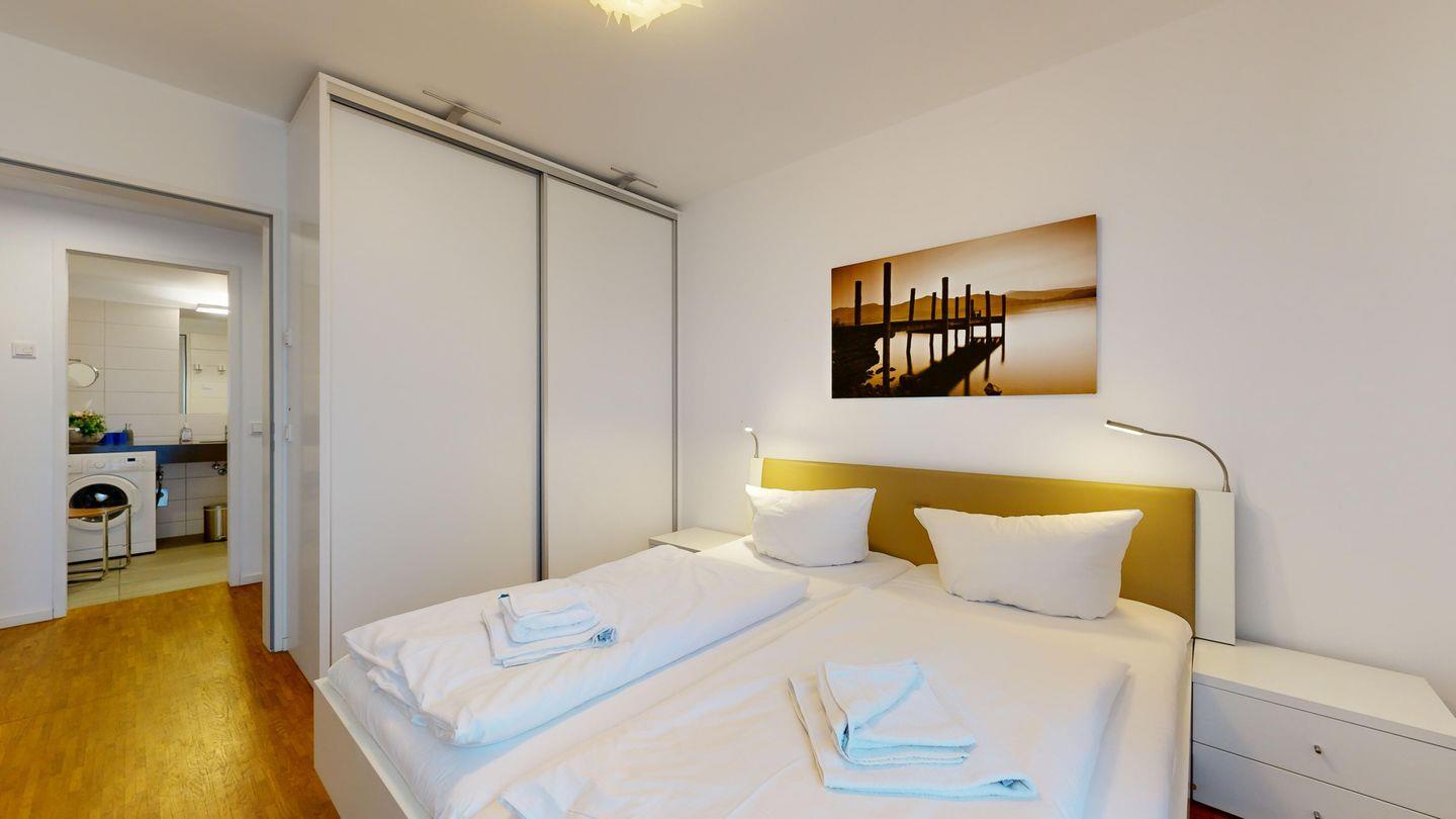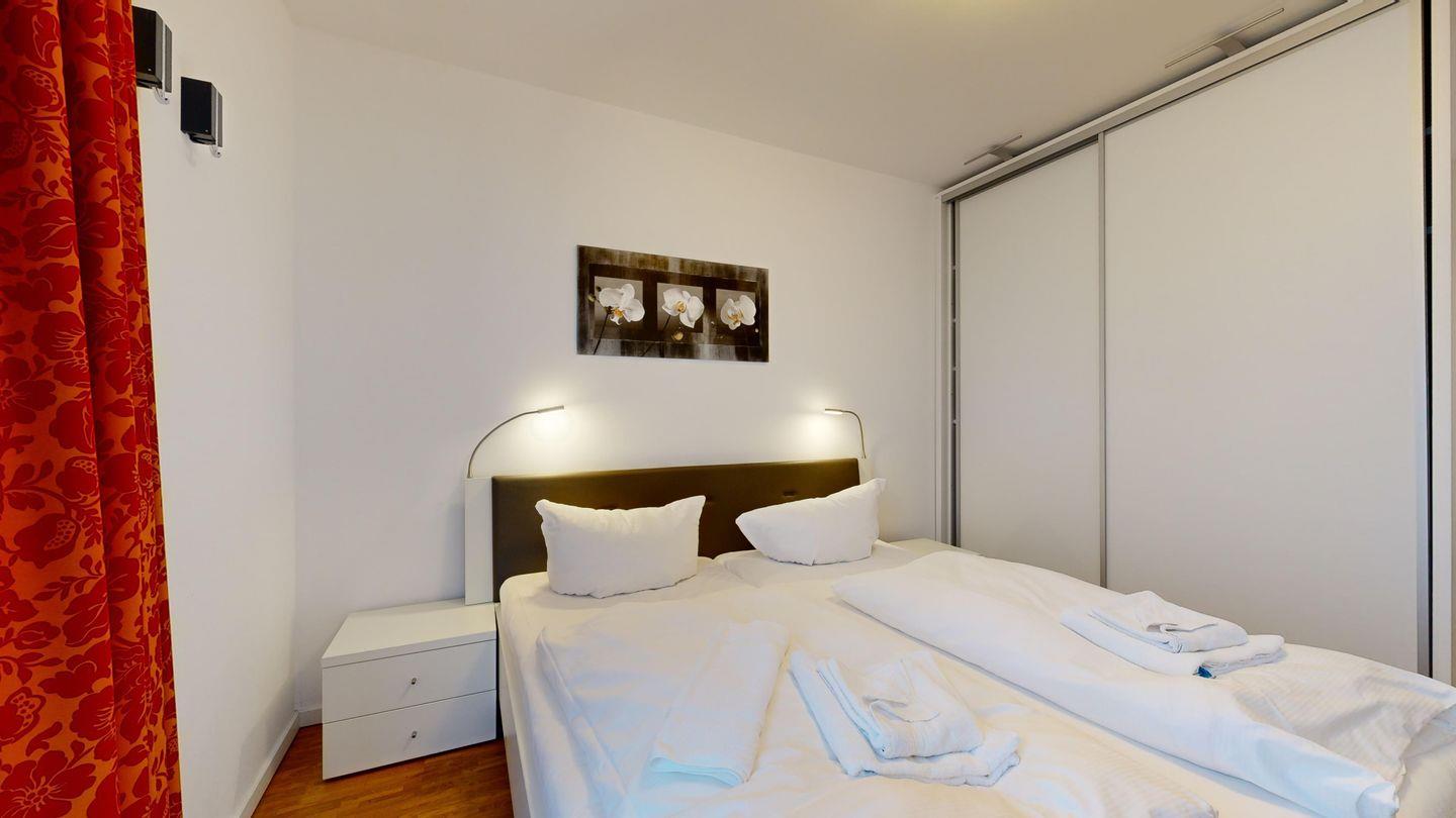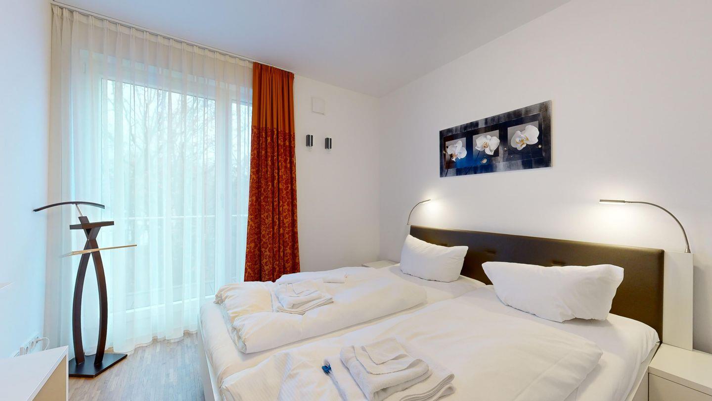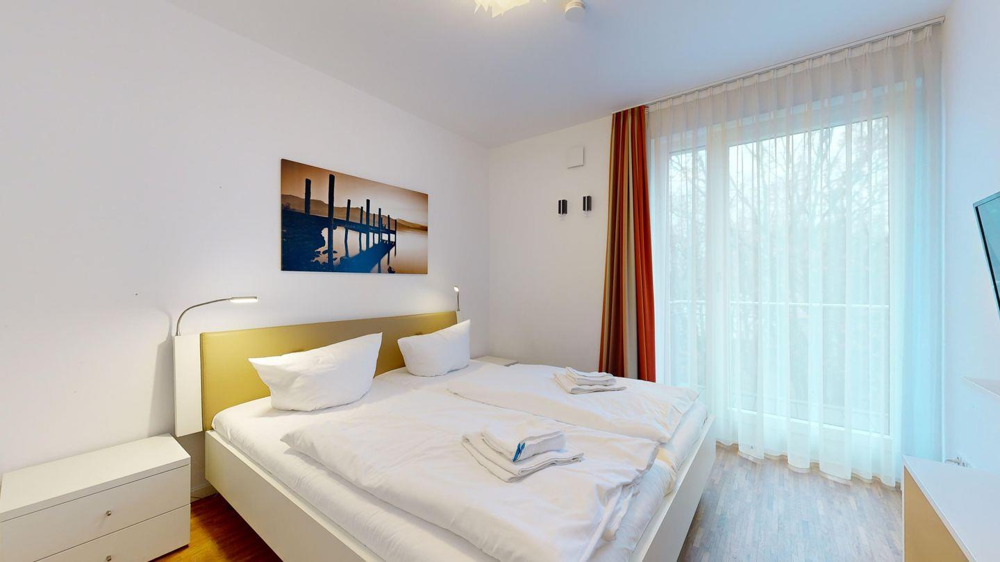 * 1 Schlafzimmer mit einem Doppelbett, Balkon