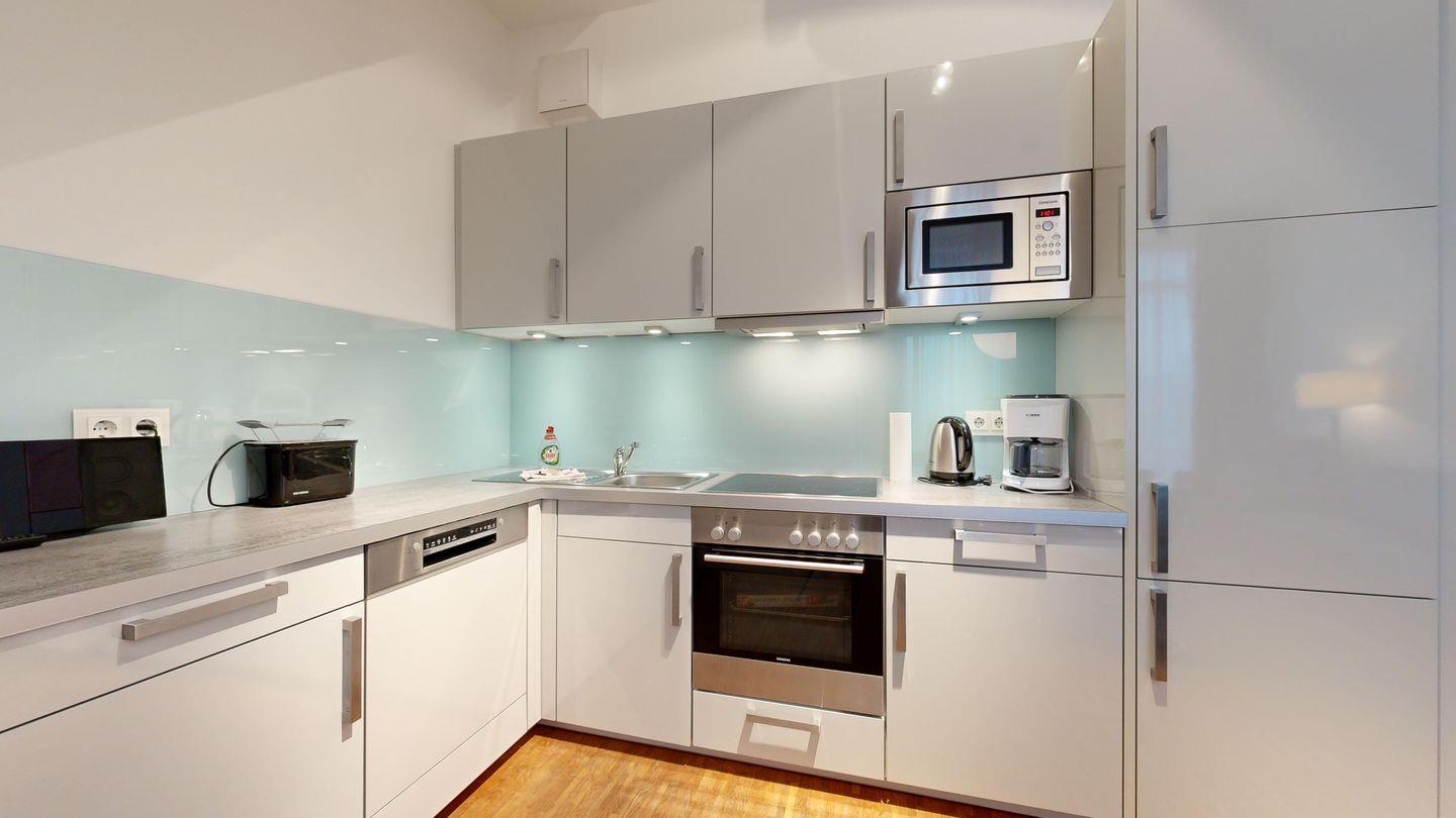 * Küche: Moderne Küchenzeile mit Ceran-Herd, Backofen, Spülmaschine, Mikrowelle, Eierkocher, Kaffeemaschine, Toaster, Wasserkocher, Bügeleisen und -brett