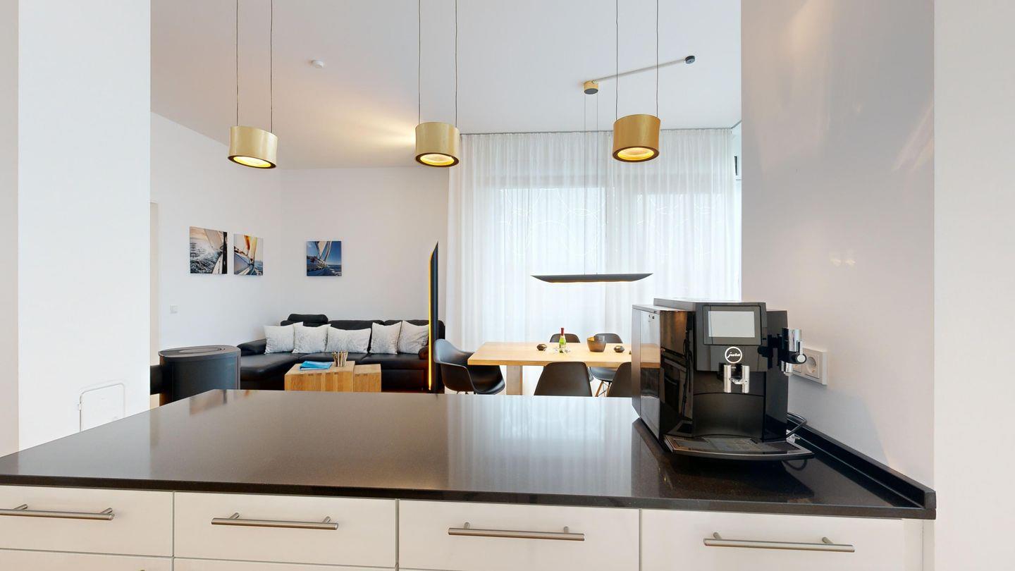 Exklusives Urlaubsgefühl im Loft-Stil: Großzügige, offene Räume, eine private Sauna in der Wohnung und ein gemütlicher Kamin sorgen für luxuriöse Wohlfühlmomente. Auf dem sonnigen Südbalkon genießen Sie den ganzen Tag über Wärme und Meerluft – perfekt für stilbewusste Genießer.