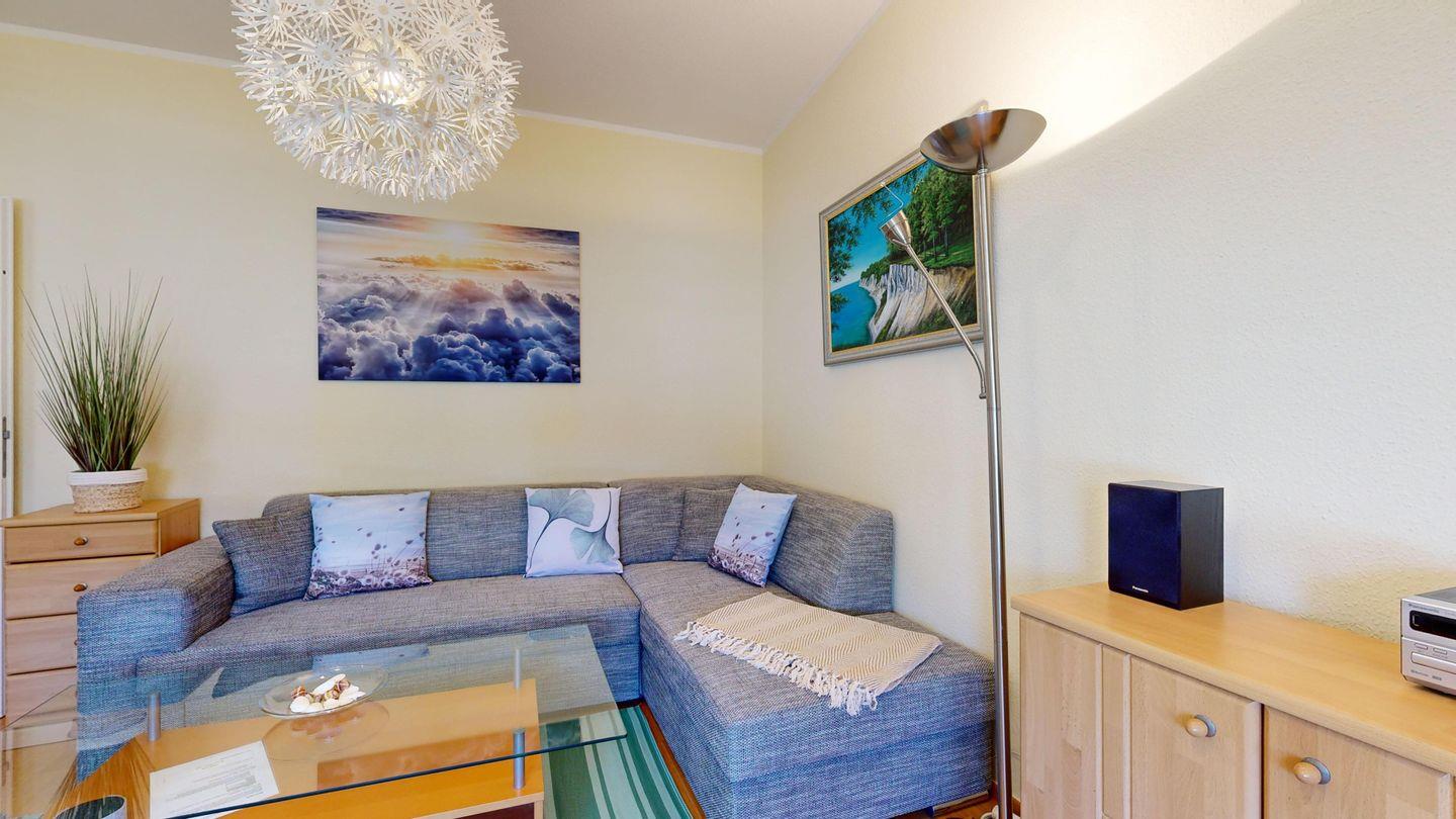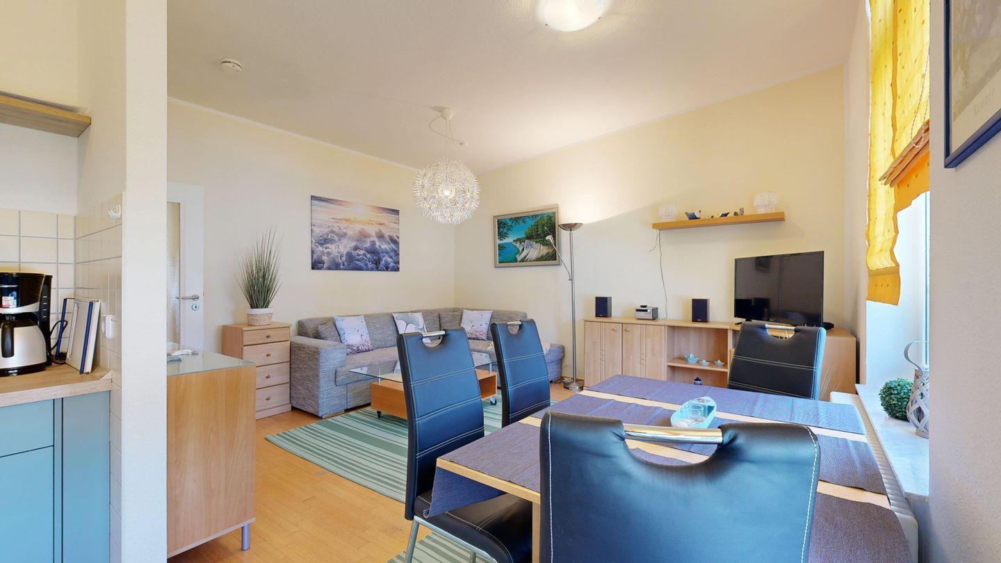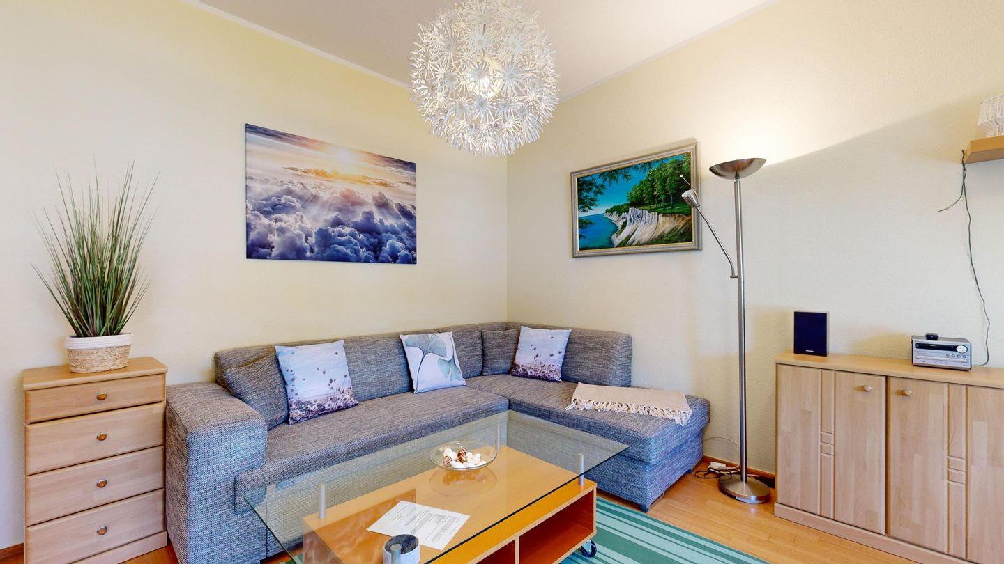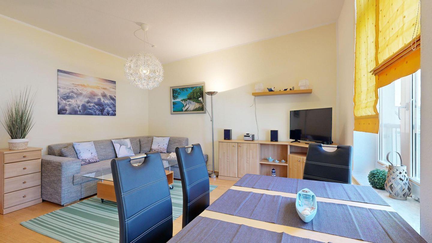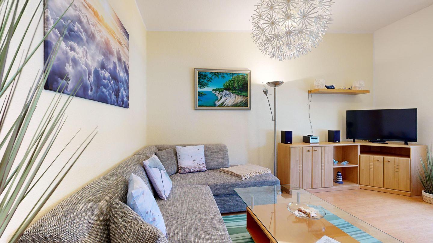 * Wohnzimmer: Couchgarnitur (Schlafgelegenheit für 1 Pers.), Kabel-TV, Radio, Essplatz