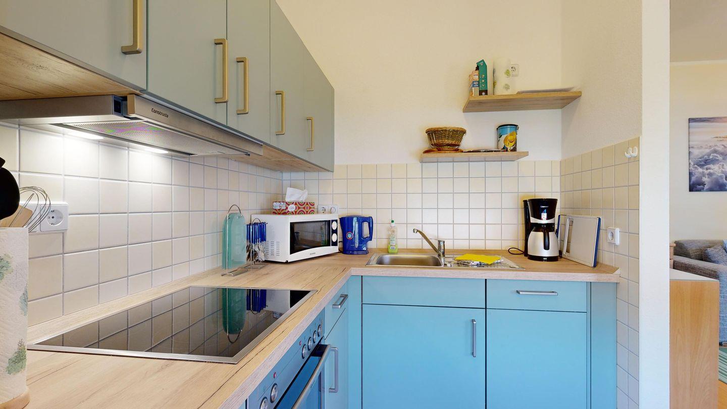 * Küche: Moderne Küchenzeile mit Ceran-Herd, Spülmaschine, Mikrowelle, Backofen, Toaster, Wasserkocher und Kaffeemaschine
