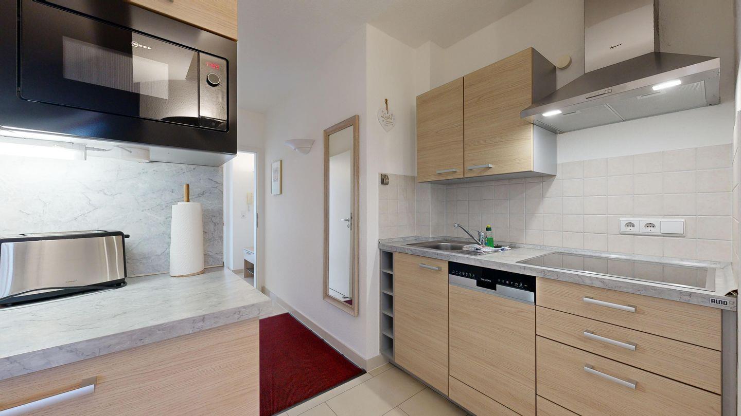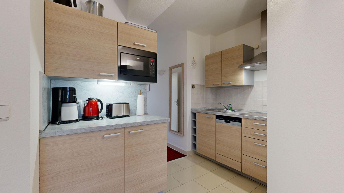 * Küche: Moderne Küchenzeile mit Ceran-Herd, Spülmaschine, Mikrowelle, Wasserkocher, Kaffeemaschine, Toaster