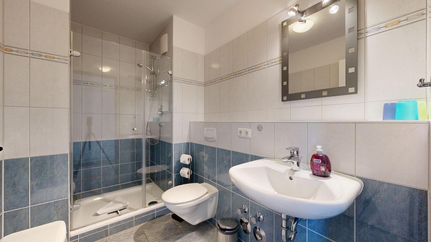 * Badezimmer mit großer Dusche, WC und Föhn