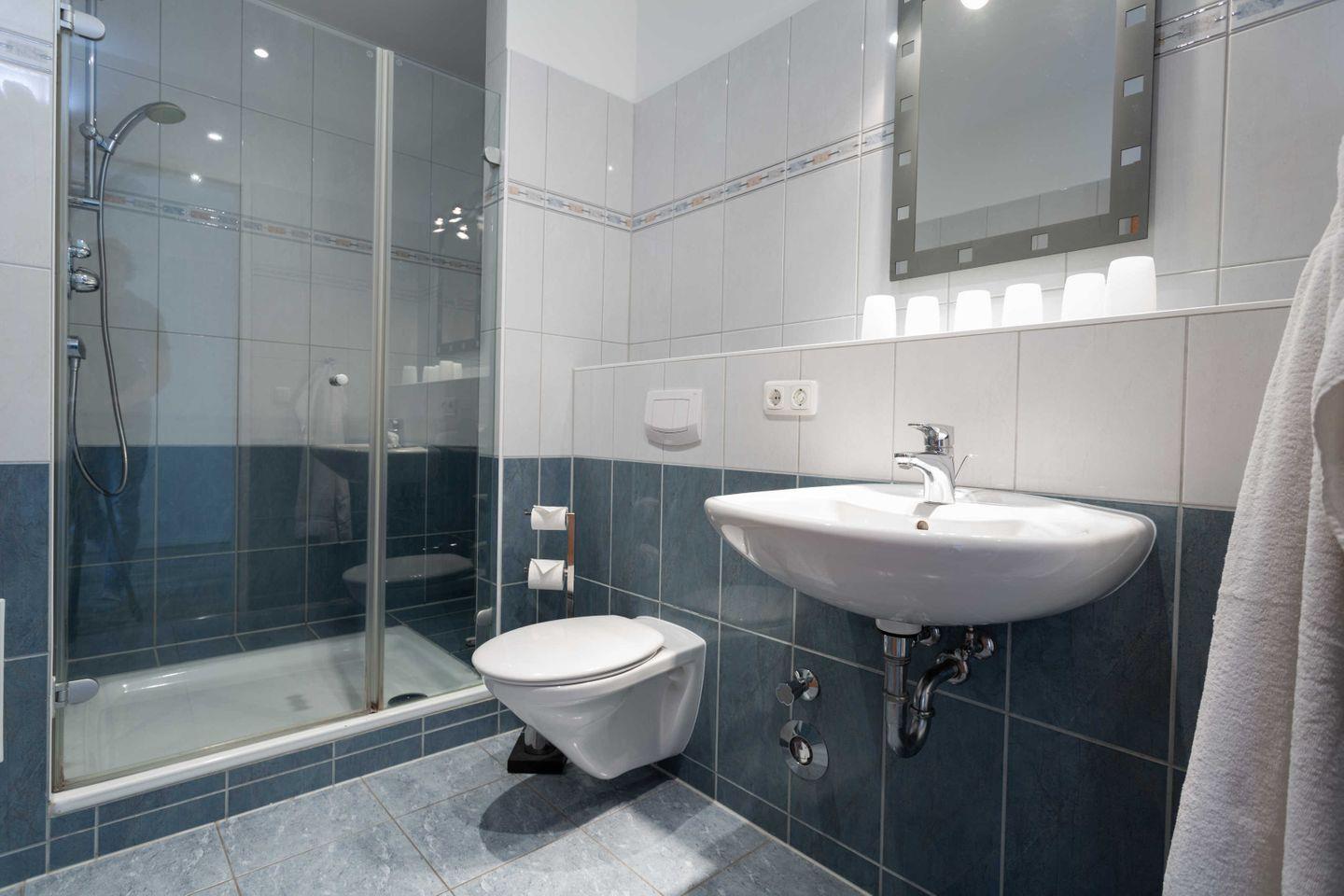 * Badezimmer mit großer Dusche, Föhn und WC