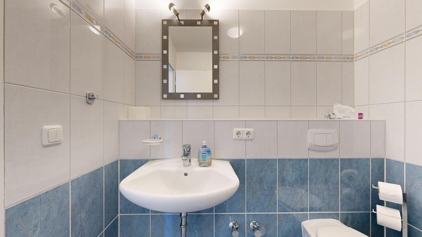 * Badezimmer mit großer Dusche, WC und Föhn