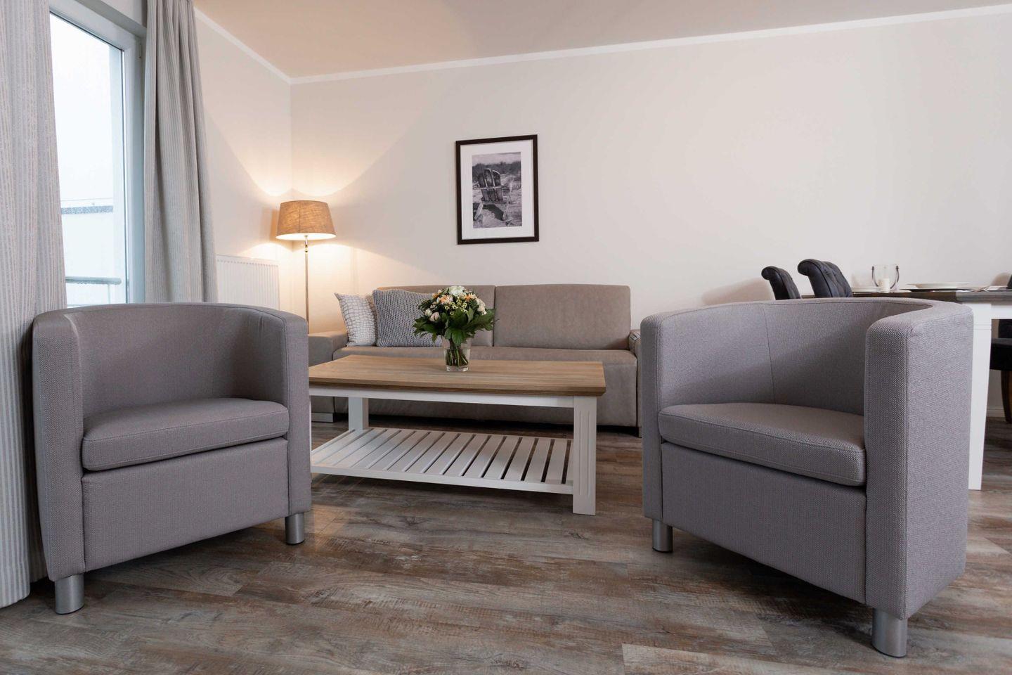 * Wohnzimmer mit Couchgarnitur (Schlafcouch für 2 Personen), Sessel, Flachbild-TV, Radio, Internetzugang (WLAN inkl.), Esstisch