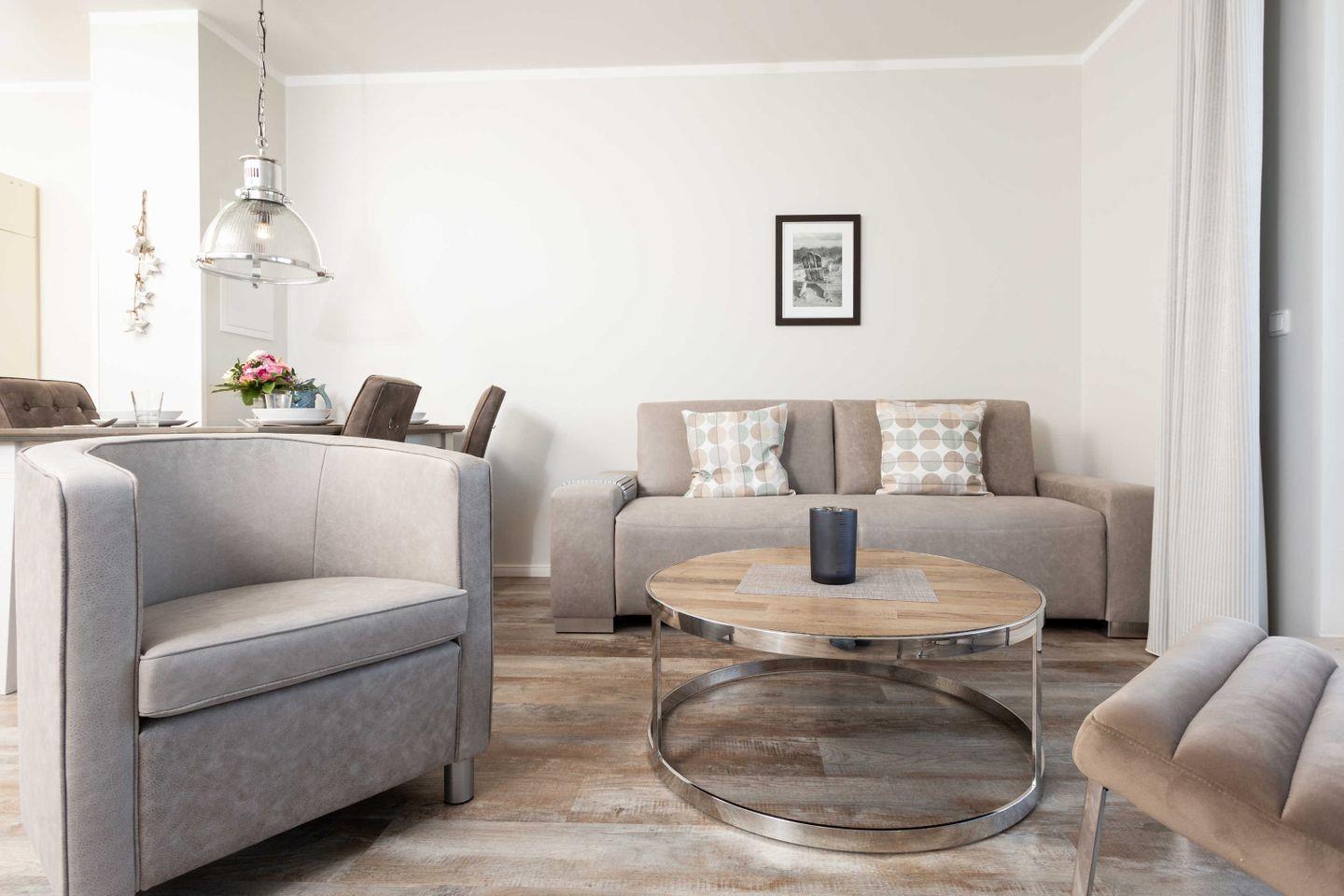 * Wohnzimmer mit Couchgarnitur (Schlafcouch für 2 Personen), Sessel, Flachbild-TV, Radio, Internetzugang (WLAN inkl.), Esstisch