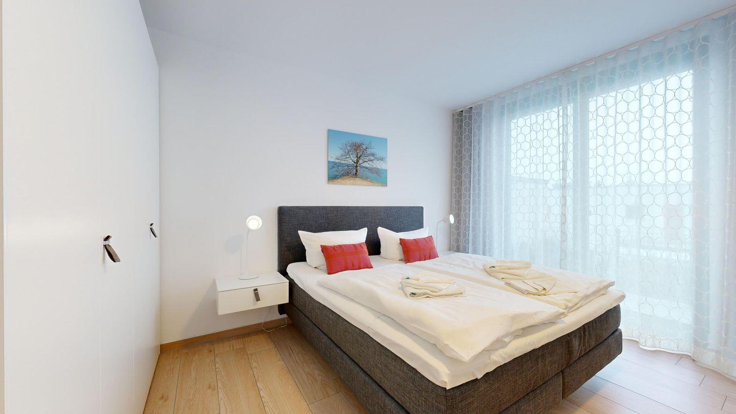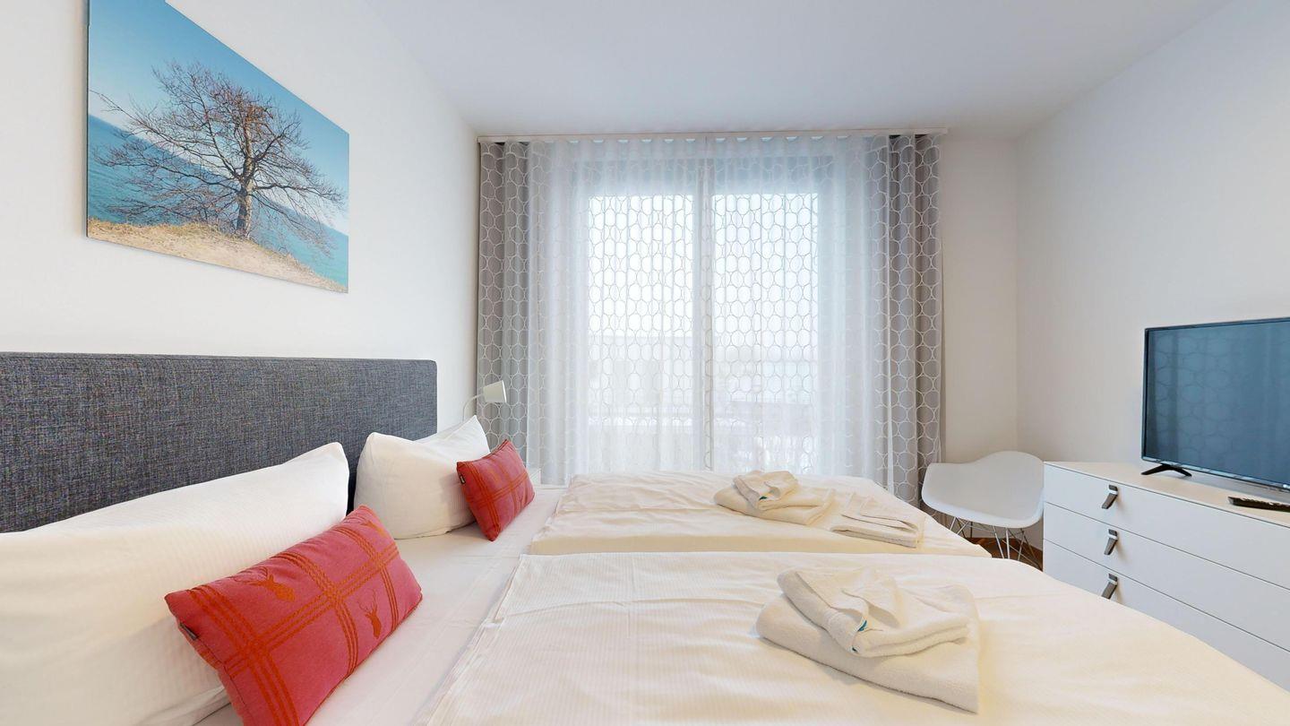 * 1 Schlafzimmer mit hochwertigen Doppelboxspringbett, TV (43 Zoll), Terrasse