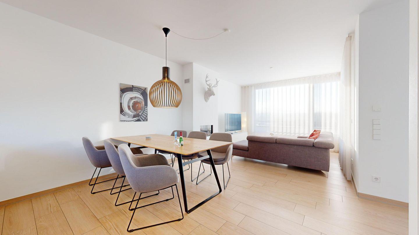 * Wohnzimmer: Sehr großer und lichtdurchfluteter Wohnbereich mit gemütliche große Eckcouchgarnitur, Kabel-TV (55 Zoll), großer Esstisch für 6 Personen, sehr große Fensterfront zum südlich ausgerichteten Balkon, großer Gaskamin mit Fernbedienung