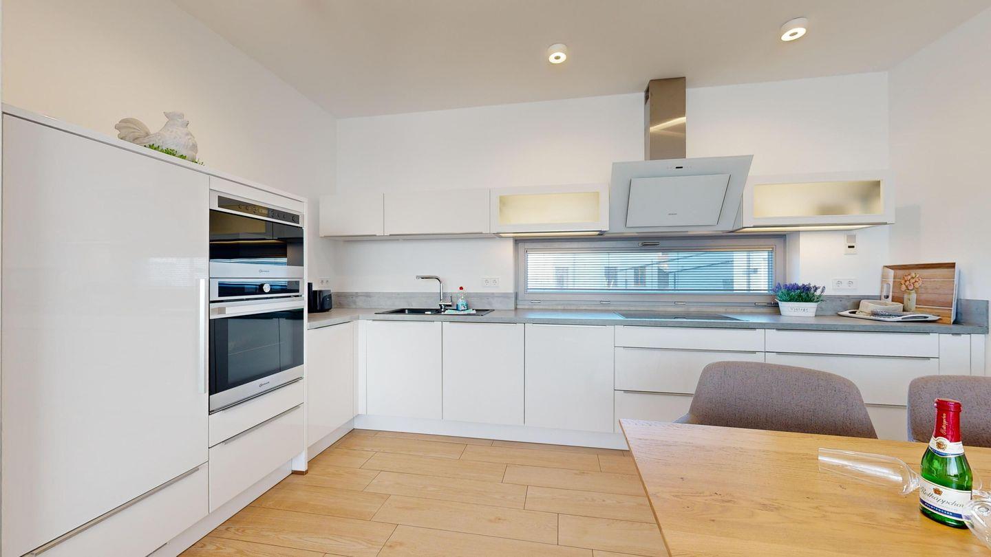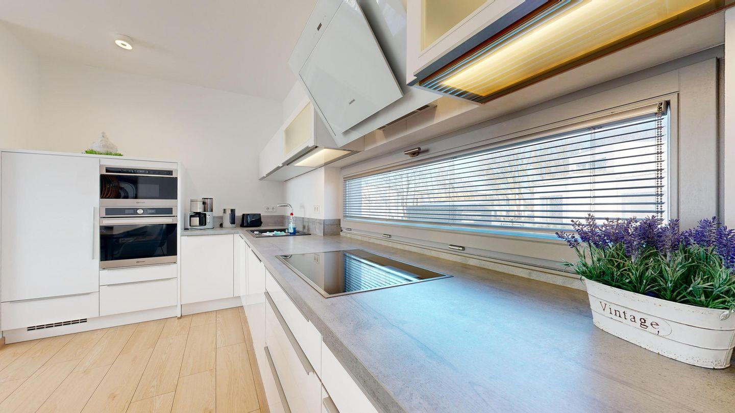 * offener Küchenbereich mit modernster Ausstattung: Spülmaschine, großes Induktionskochfeld, großer Kühlschrank mit Gefrierfach, Kaffeemaschine, Mikrowelle, Backofen, Toaster, Radio, Wasserkocher