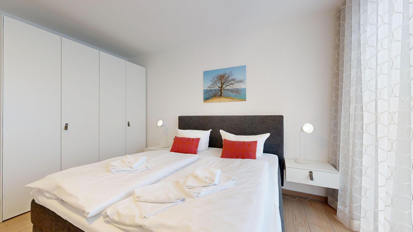 * 1 Schlafzimmer mit hochwertigem Doppelboxspringbett, TV (43 Zoll), Terrasse