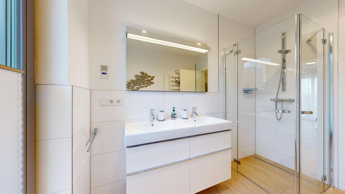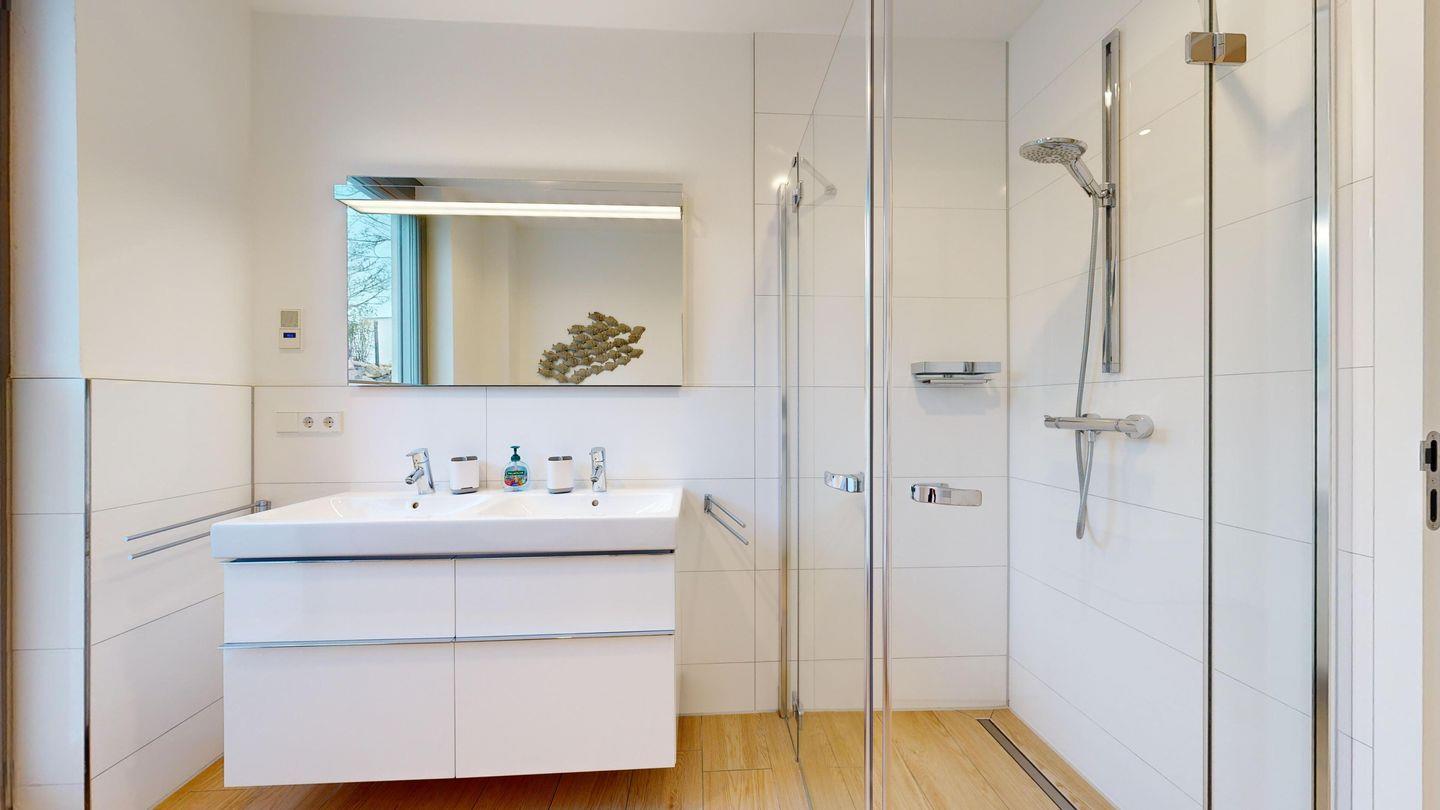 * Badezimmer mit Dusche mit ebenerdigen Einstieg, WC, Föhn, Radio