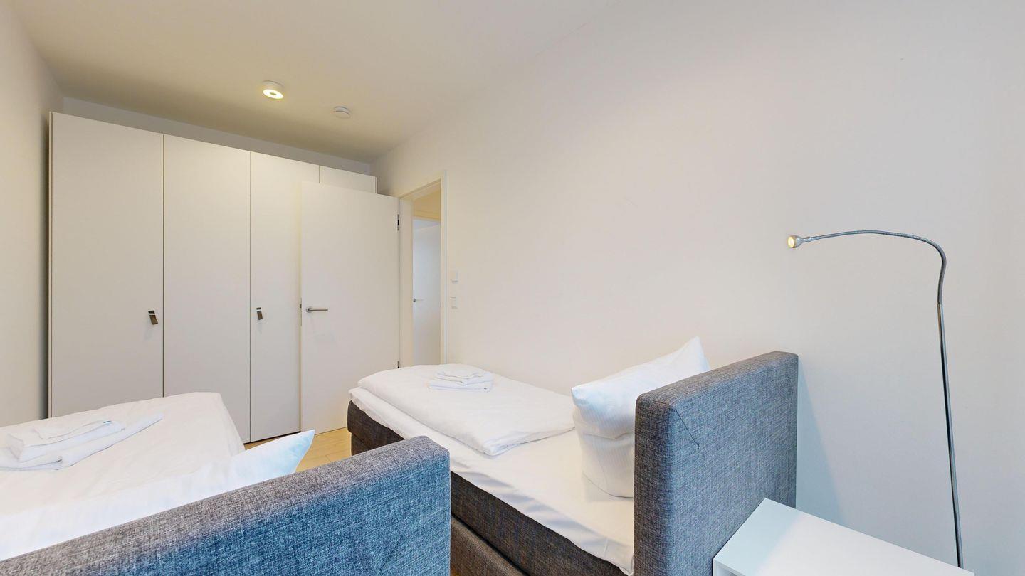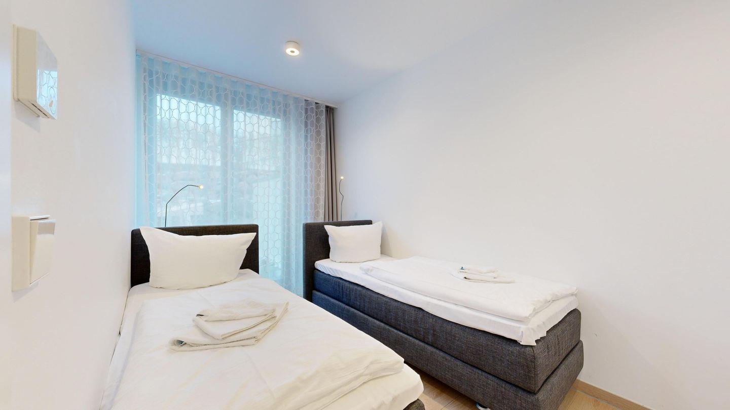* 1 Schlafzimmer mit zwei Einzelboxspringbetten (80 x 200 cm), TV (32 Zoll)