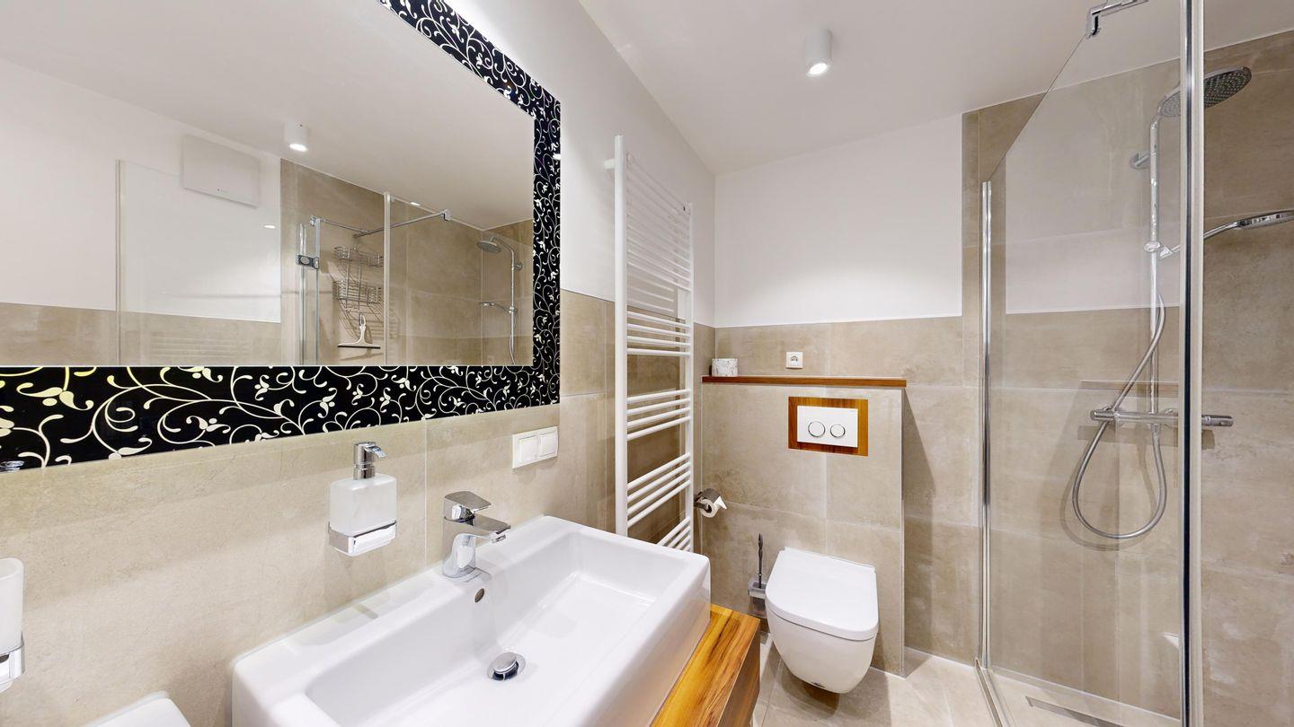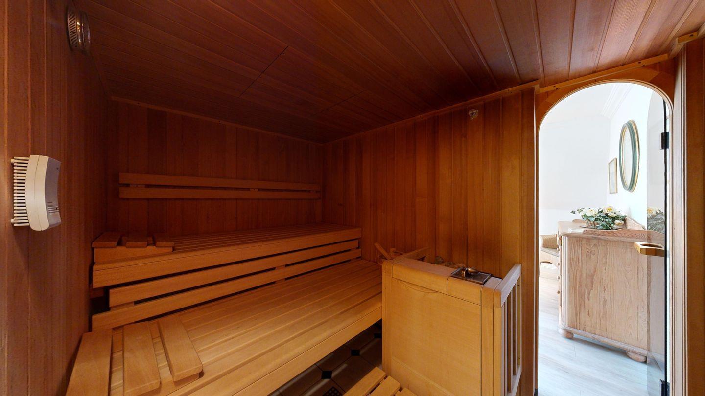 * ein großes Badezimmer mit Doppelwaschbecken, Dusche, WC, Sauna und Föhn
