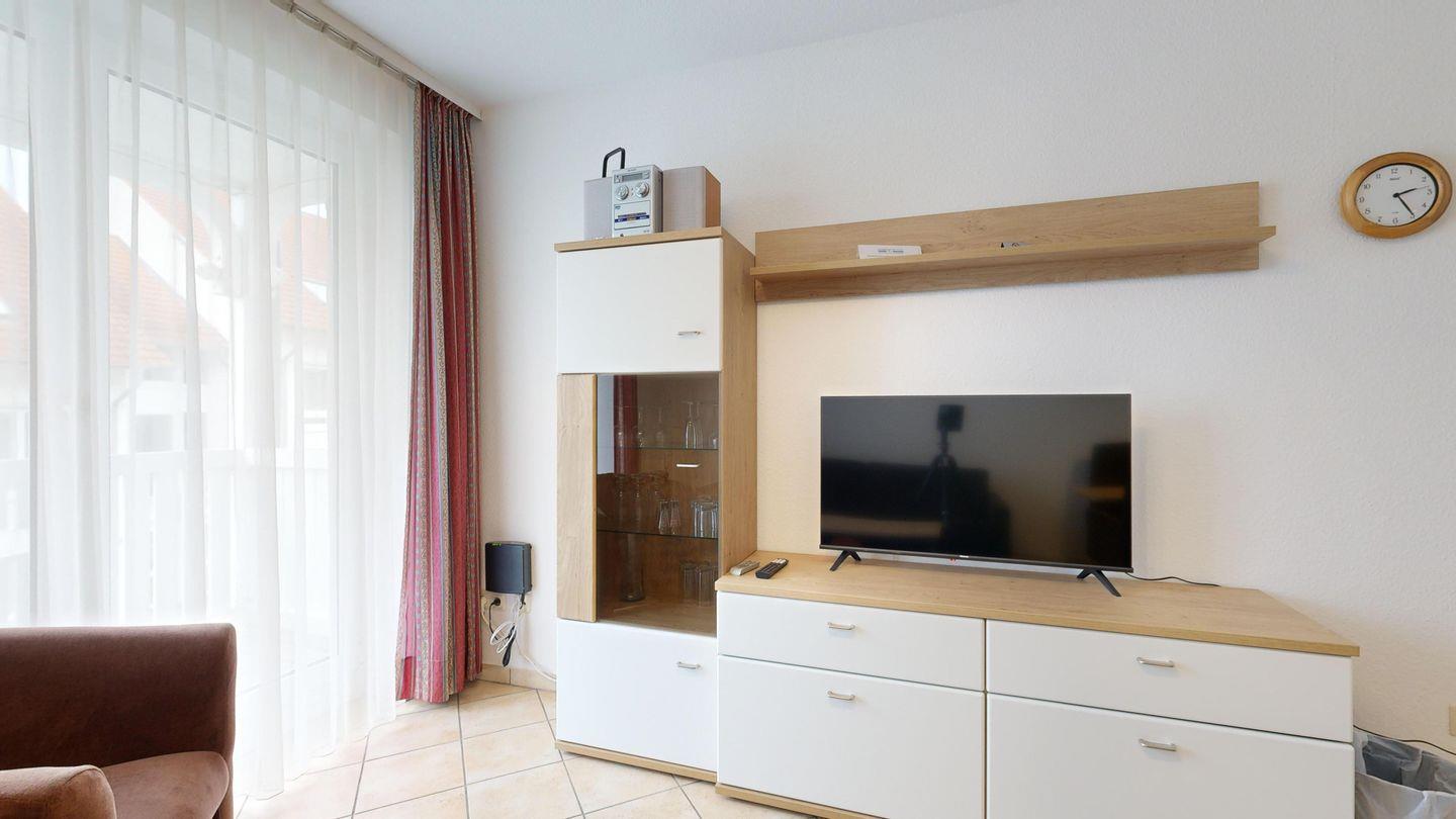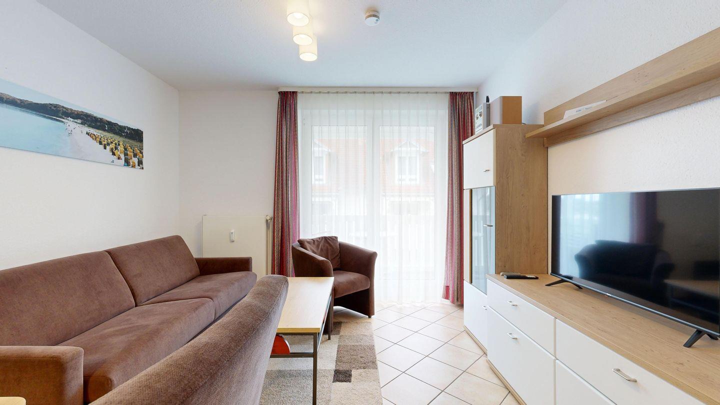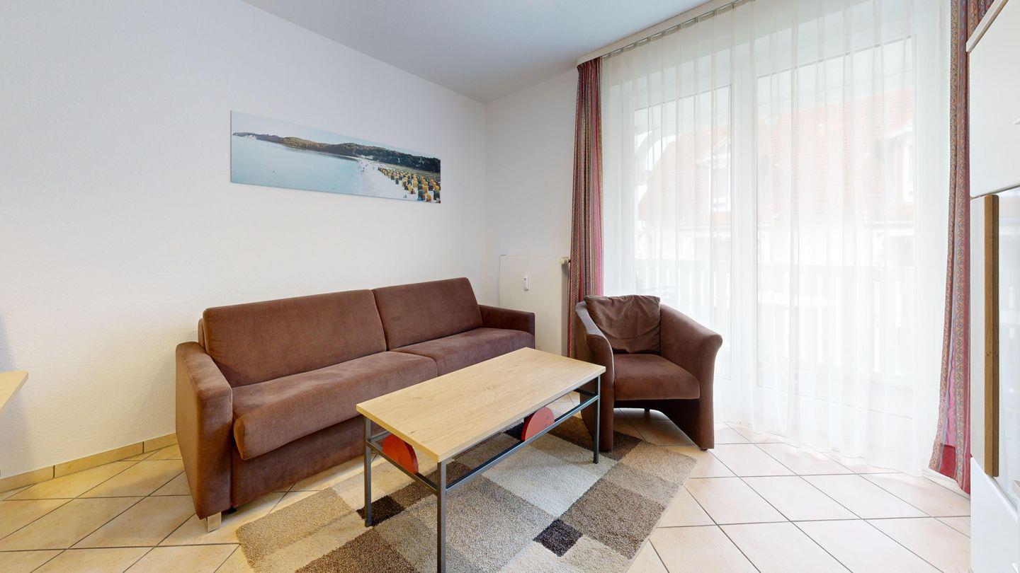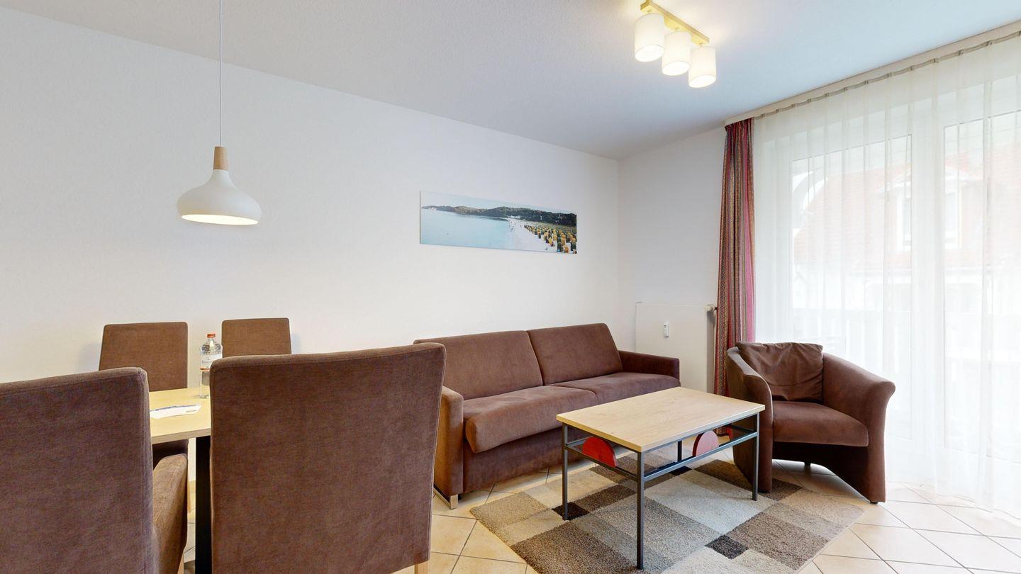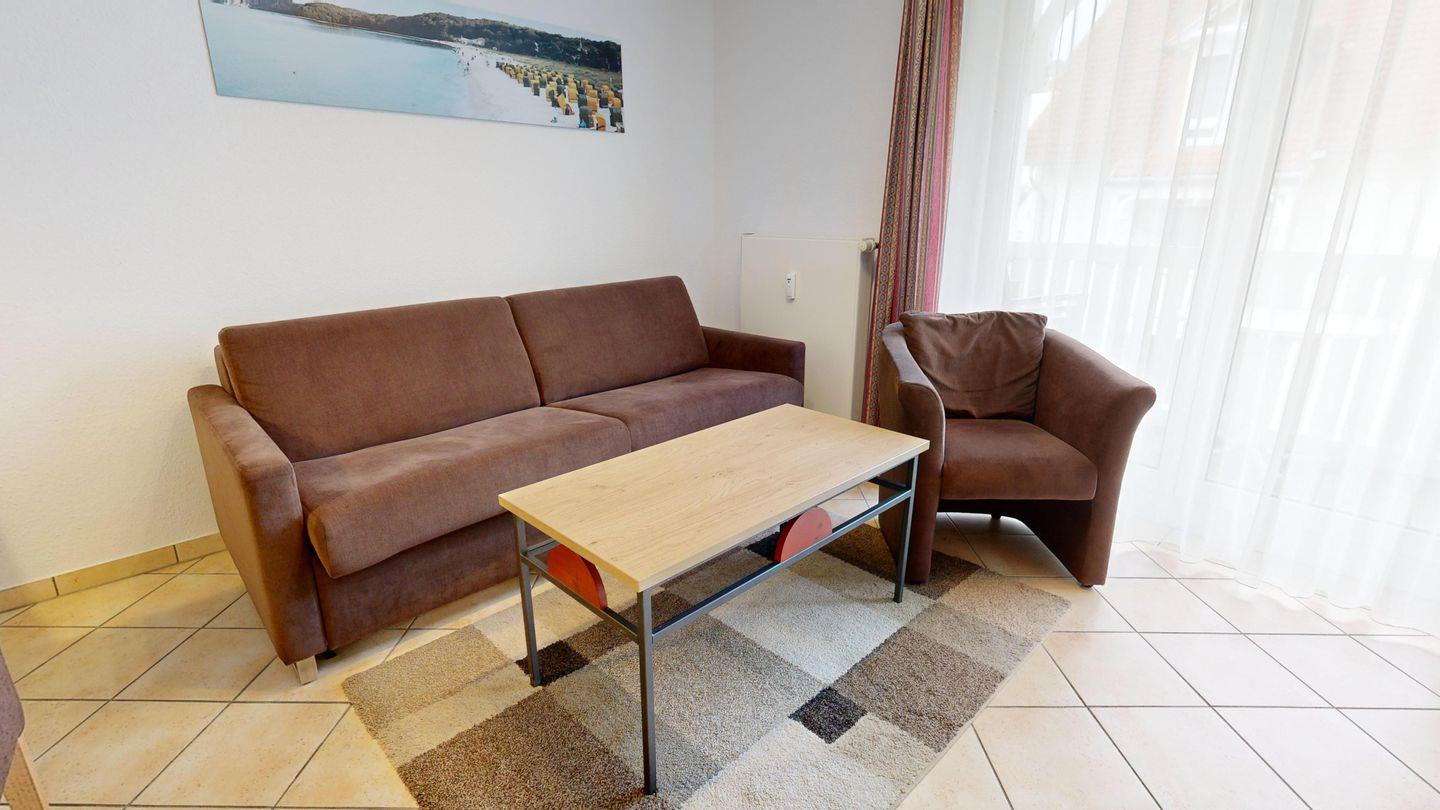 * Wohnzimmer: Couchgarnitur (Schlafgelegenheit für 2 Personen), Kabel-TV, Stereoanlage, Internetanschluss (WLAN), Esstisch