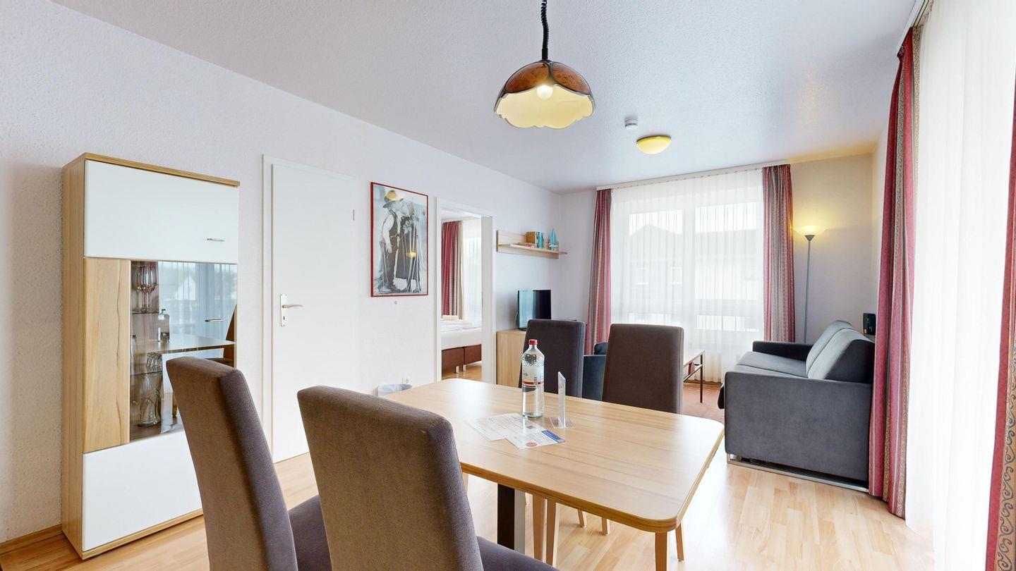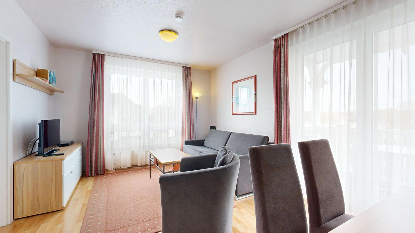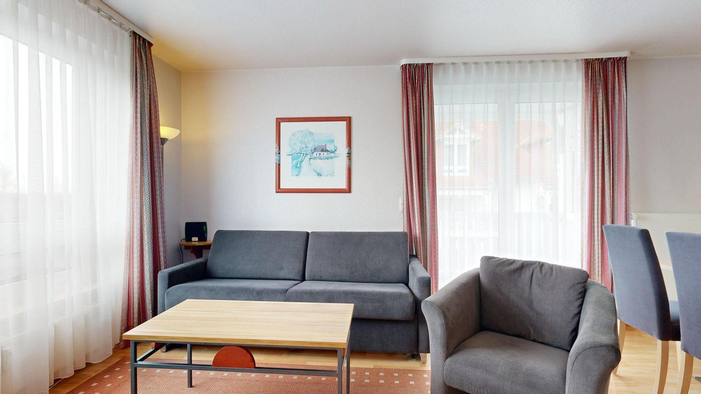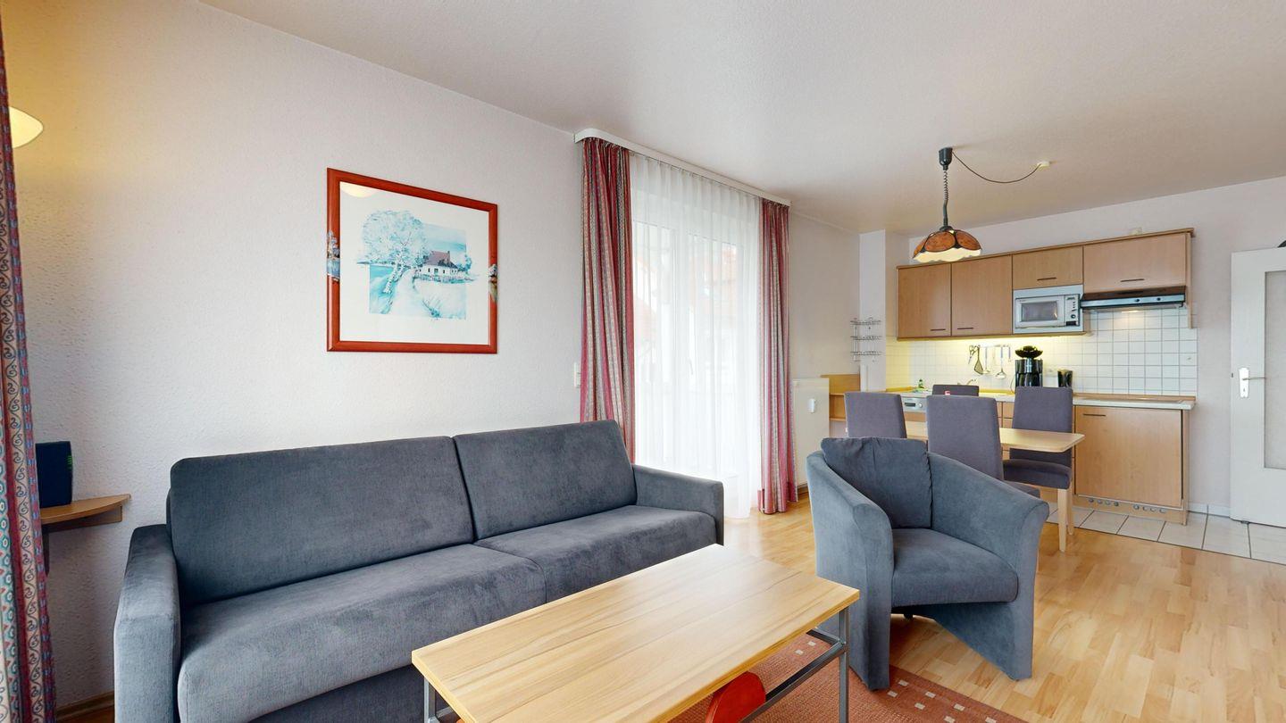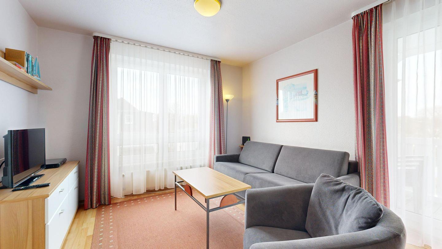 * Wohnzimmer: Couchgarnitur (Schlafgelegenheit für 2 Personen), Kabel-TV, Internetanschluss-WLAN, Esstisch