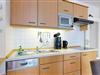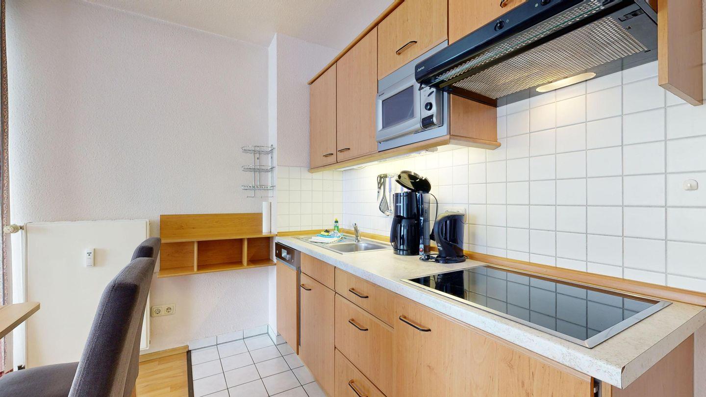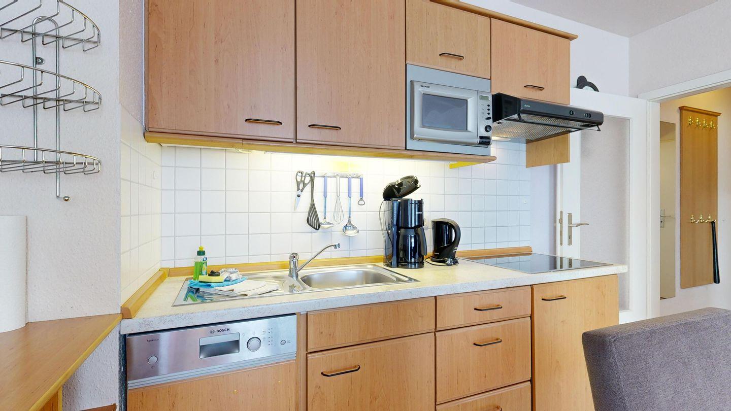 * Küchenzeile mit Spülmaschine, Ceranfeld, Mikrowelle, Kaffeemaschine, Toaster und Kühlschrank mit Gefrierfach