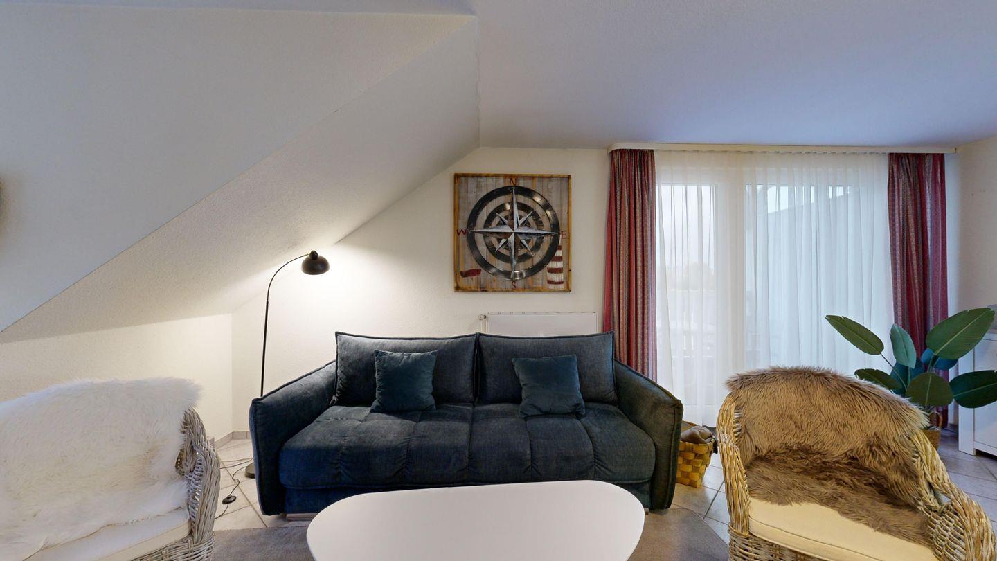 * Wohnzimmer: Couchgarnitur (Schlafgelegenheit für 2 Personen), Kabel-TV, Stereoanlage, Internetanschluss (WLAN), Esstisch
