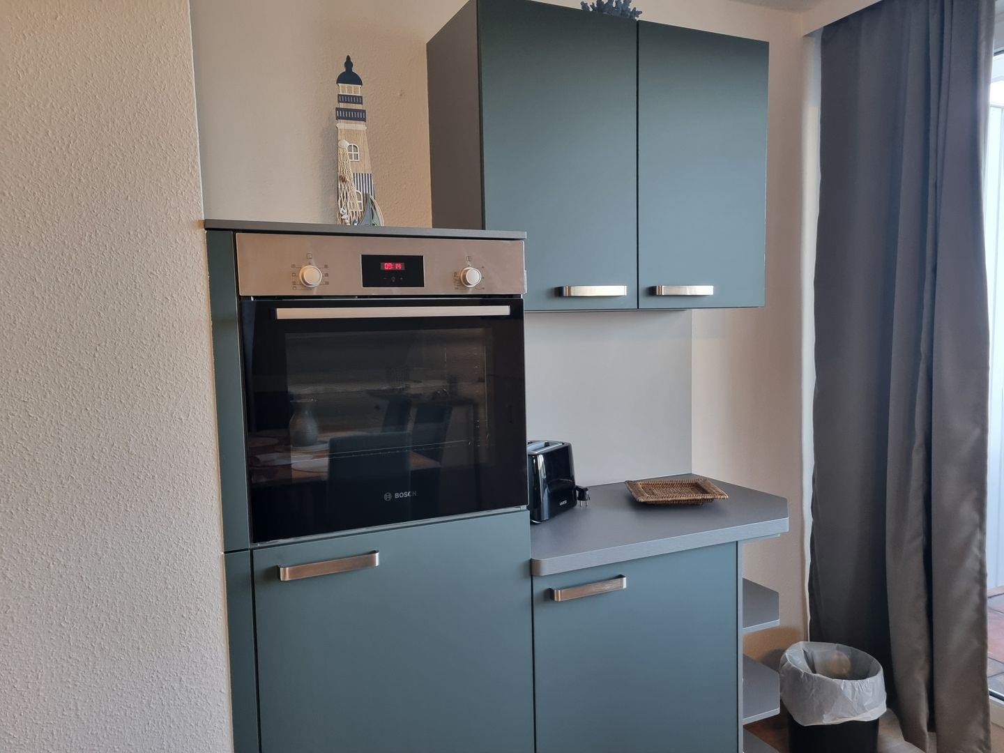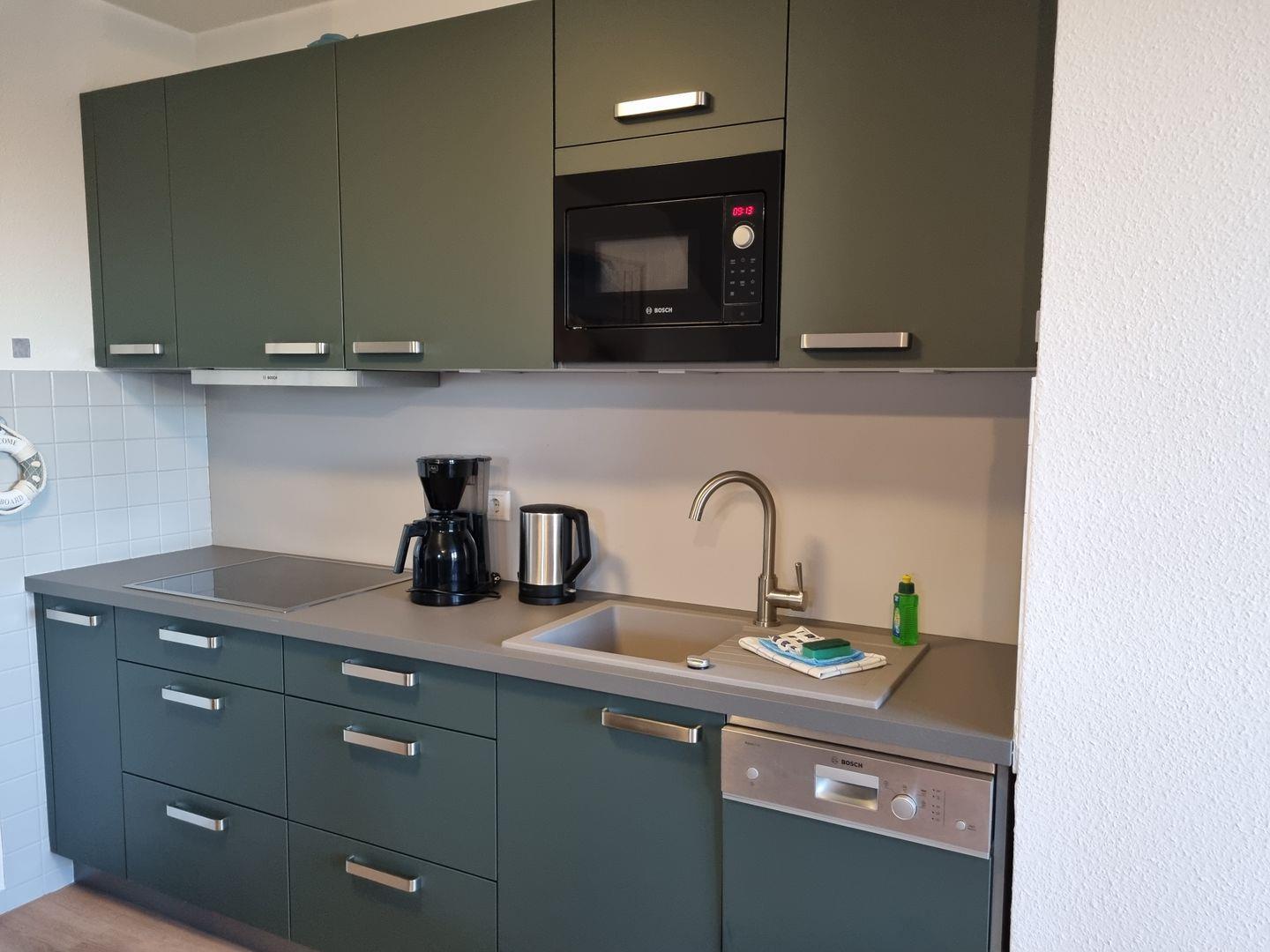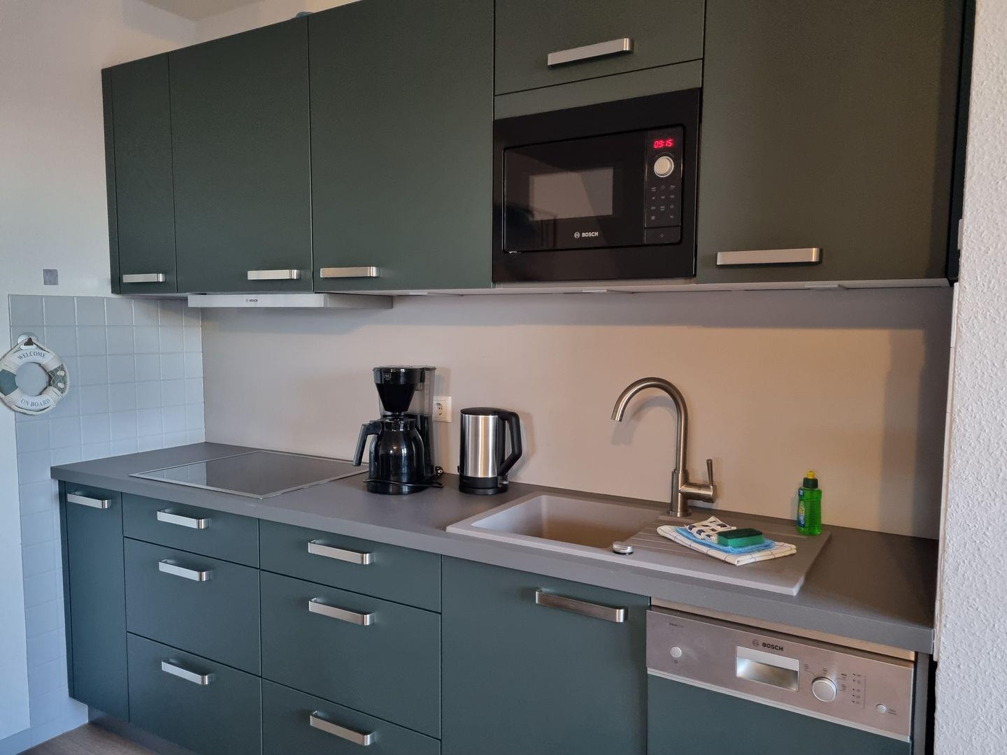 * Küchenzeile mit Spülmaschine, Ceranfeld, Mikrowelle, Kaffeemaschine, Toaster und Kühlschrank mit Gefrierfach