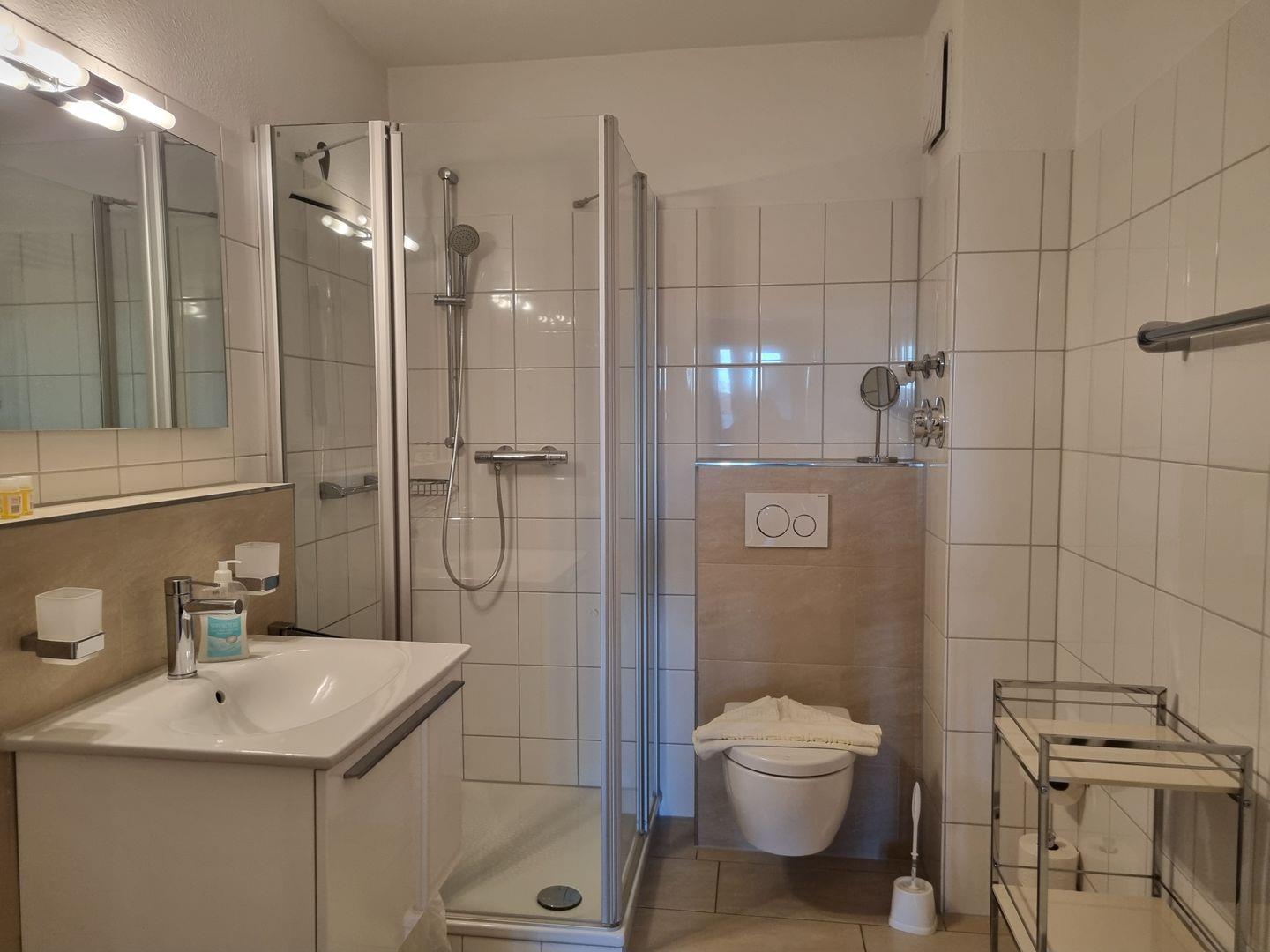 * Dusche (Tiefeinsteiger), WC, Haartrockner
