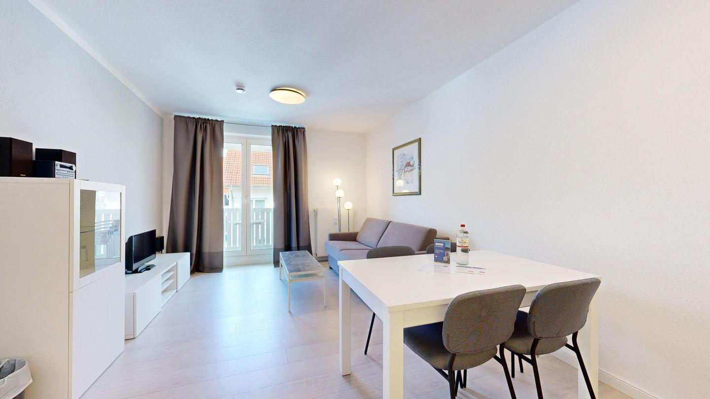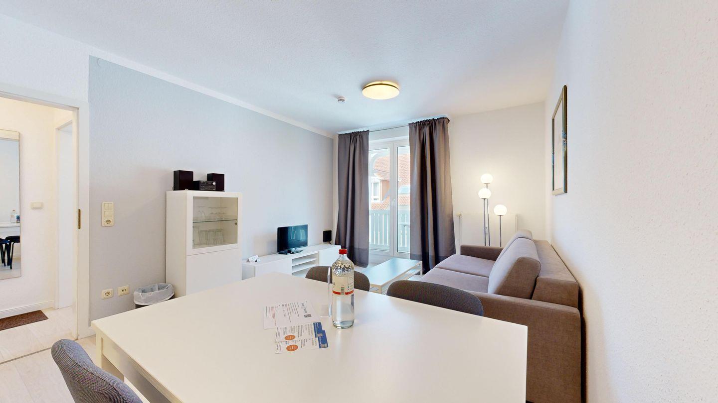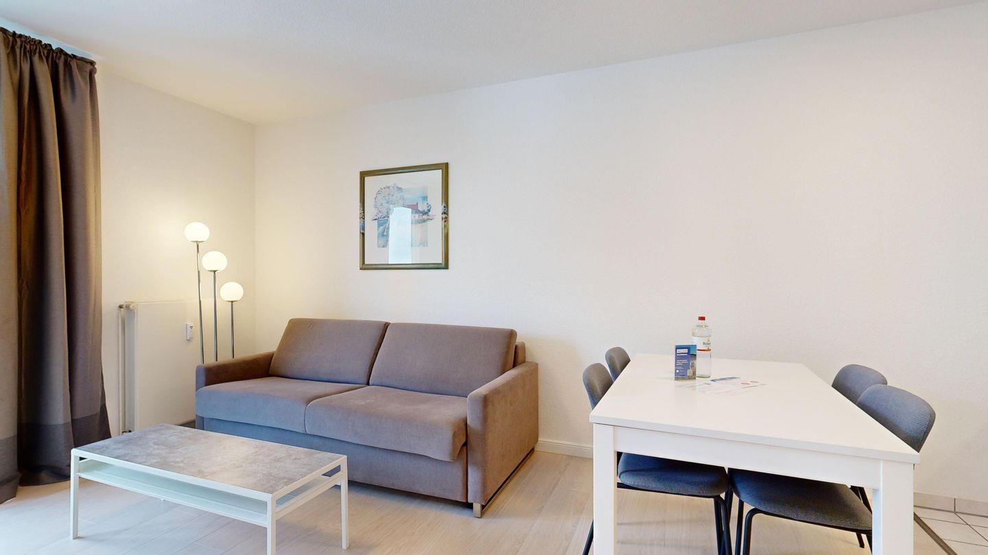* Wohnzimmer: Couchgarnitur (Schlafgelegenheit für 2 Personen), Kabel-TV, Stereoanlage, Internetanschluss (WLAN), Esstisch