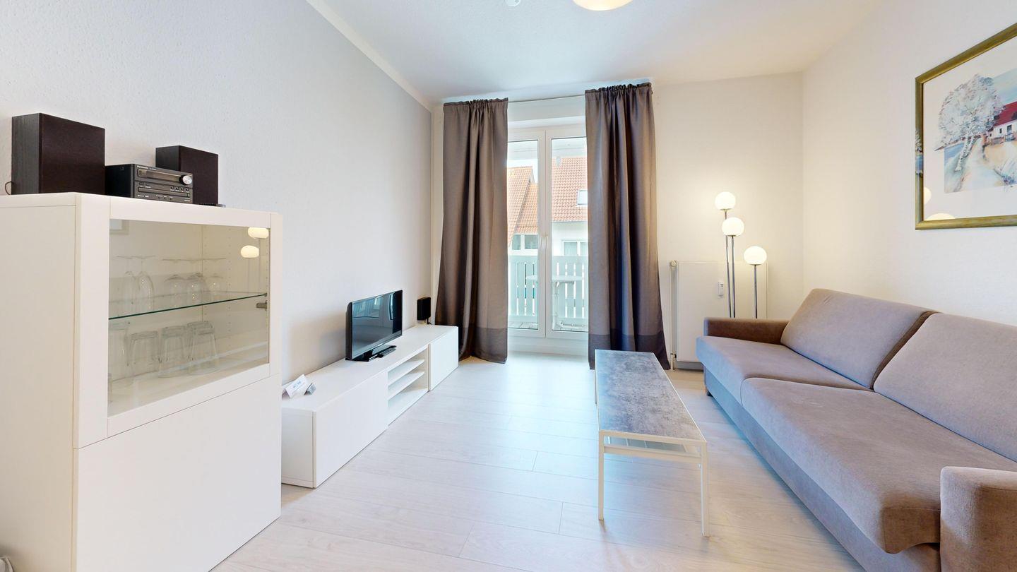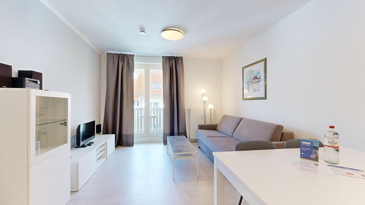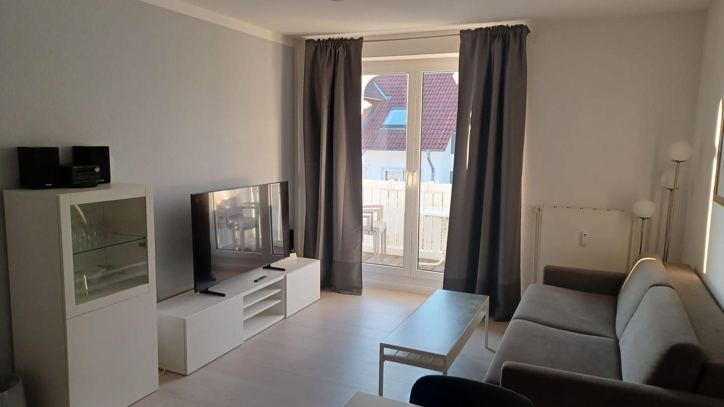 * Wohnzimmer: Couchgarnitur (Schlafgelegenheit für 2 Personen), Kabel-TV, Stereoanlage, Internetanschluss (WLAN), Esstisch