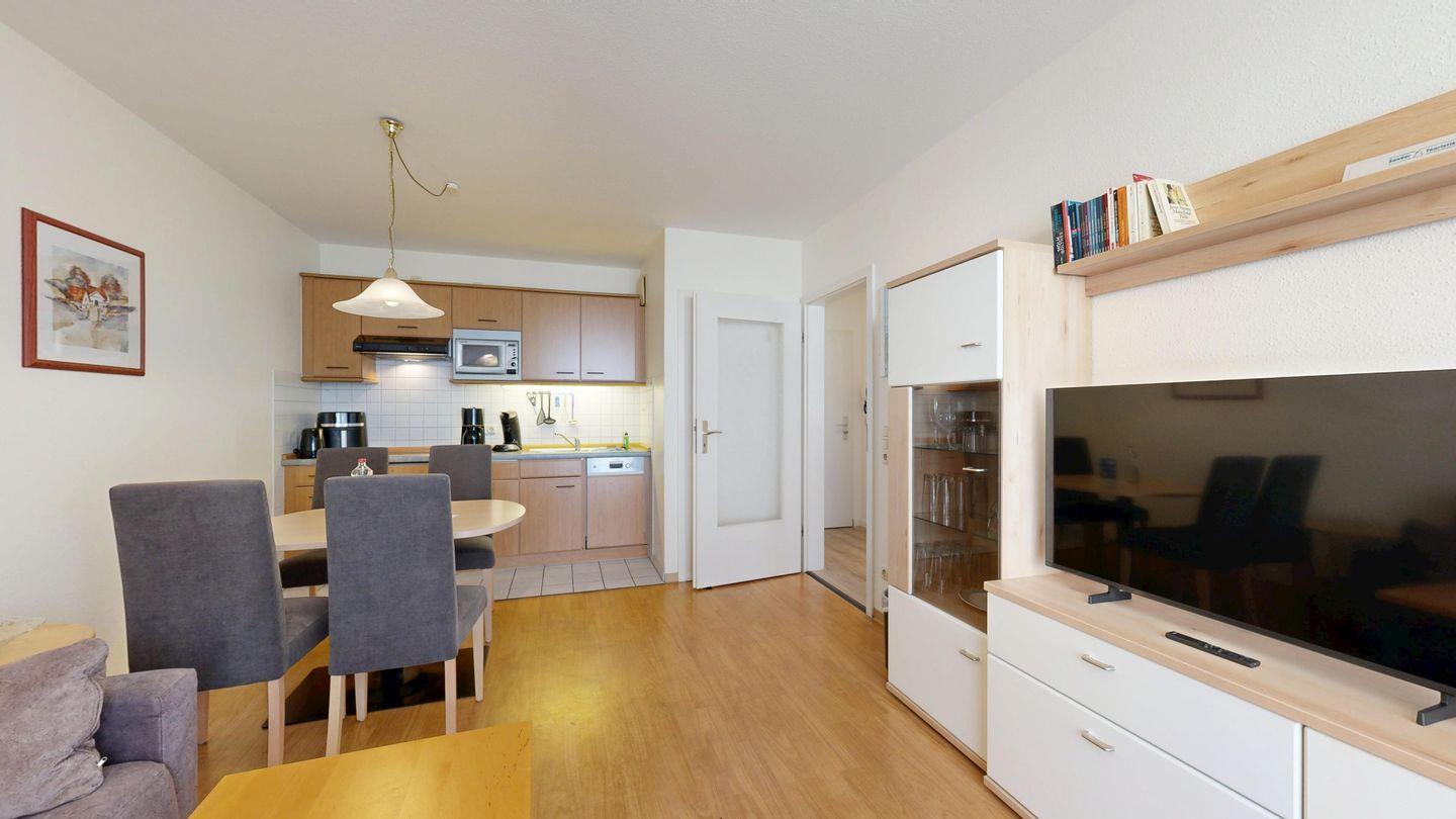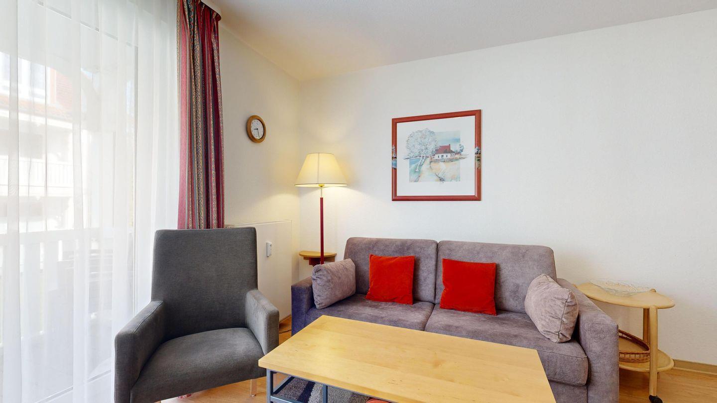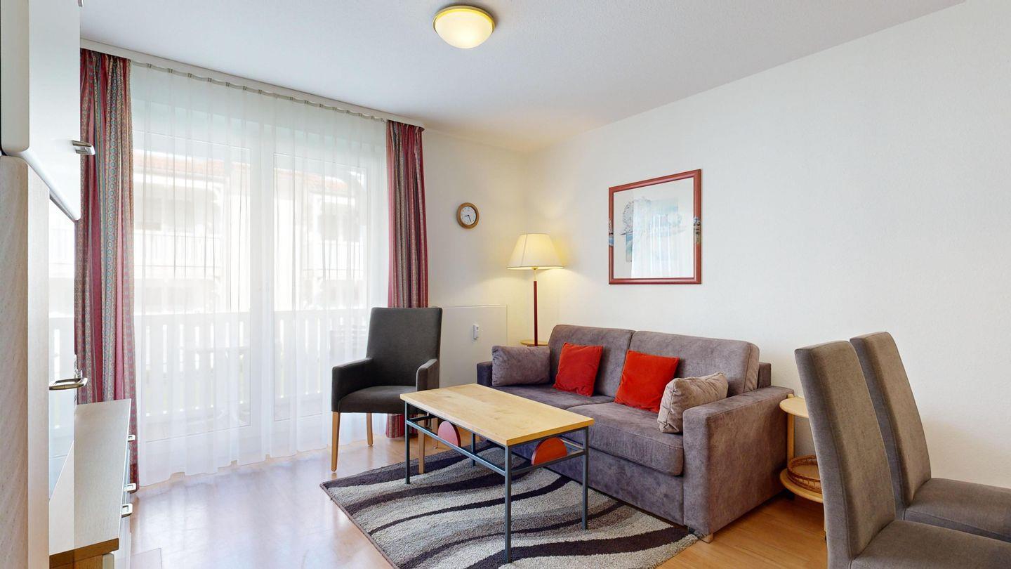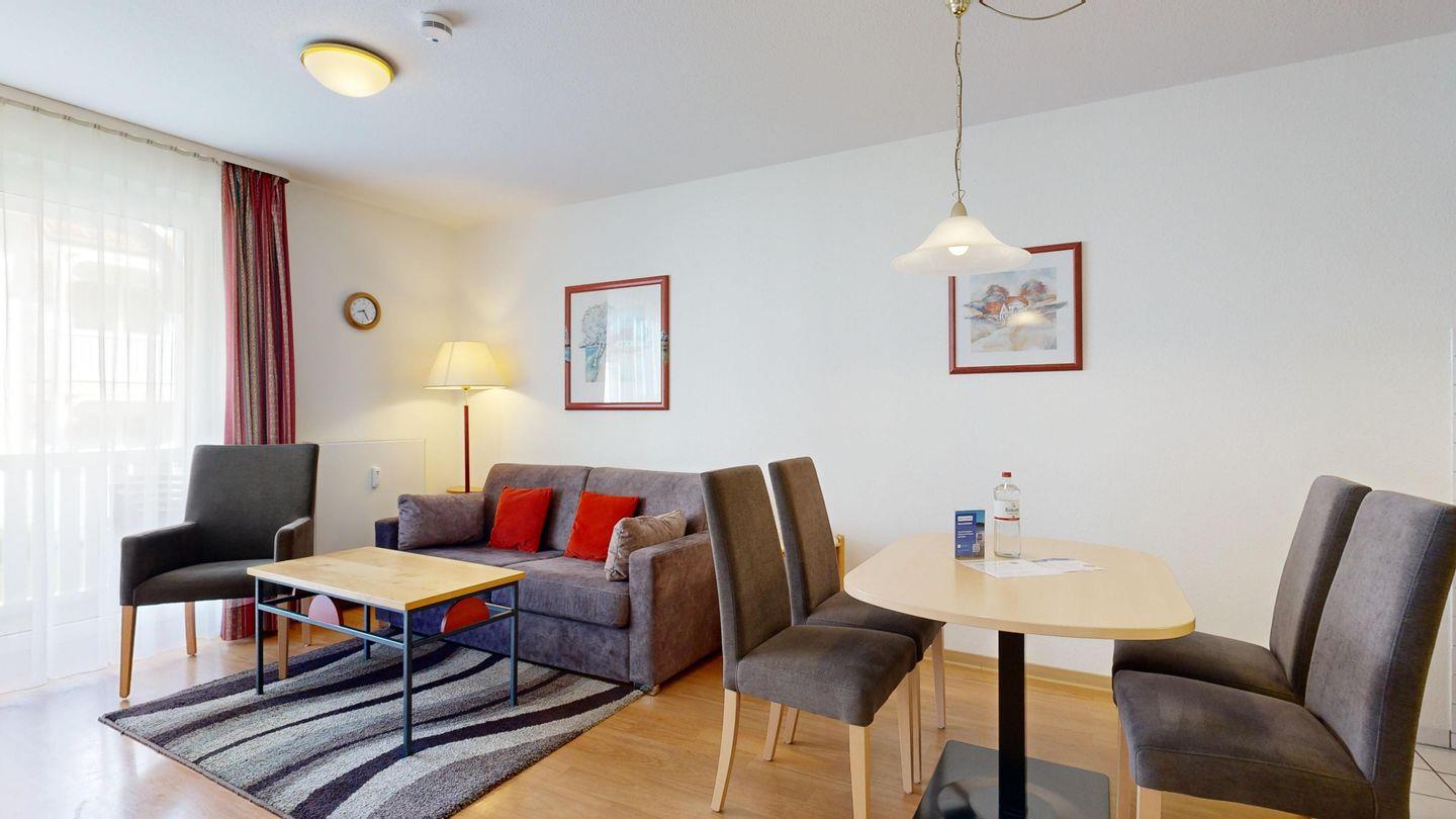 * Wohnzimmer: Couchgarnitur (Schlafgelegenheit für 2 Personen), Kabel-TV, Stereoanlage, Internetanschluss (WLAN), Esstisch