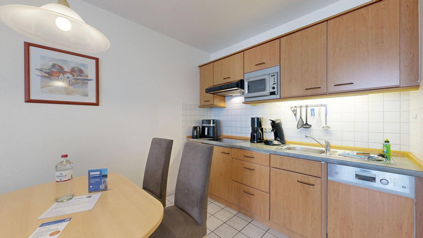 * Küchenzeile mit Spülmaschine, Ceranfeld, Mikrowelle, Nespressomaschine,Heißluftfritteuse, Toaster und Kühlschrank mit Gefrierfach