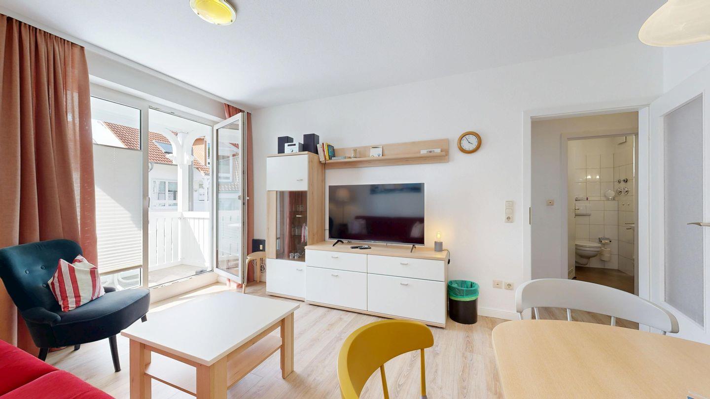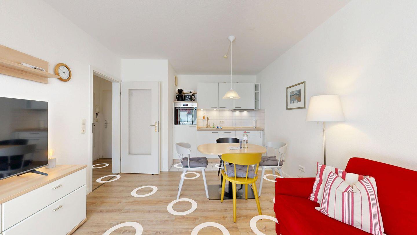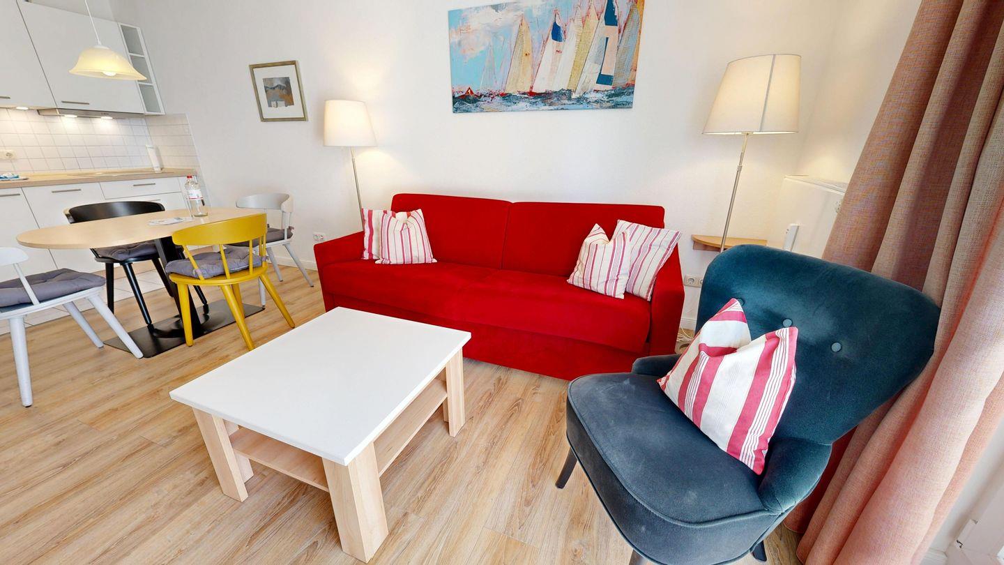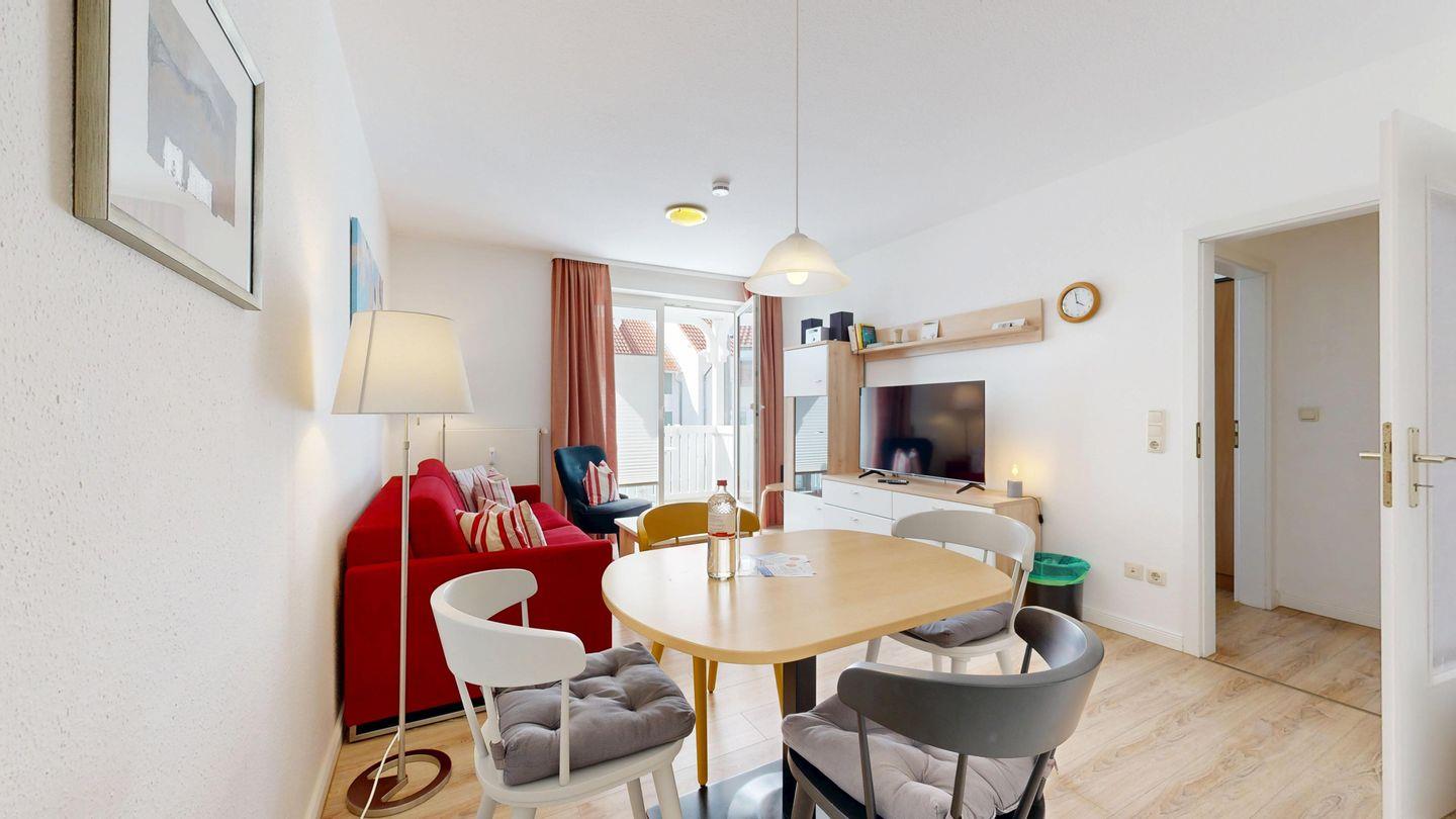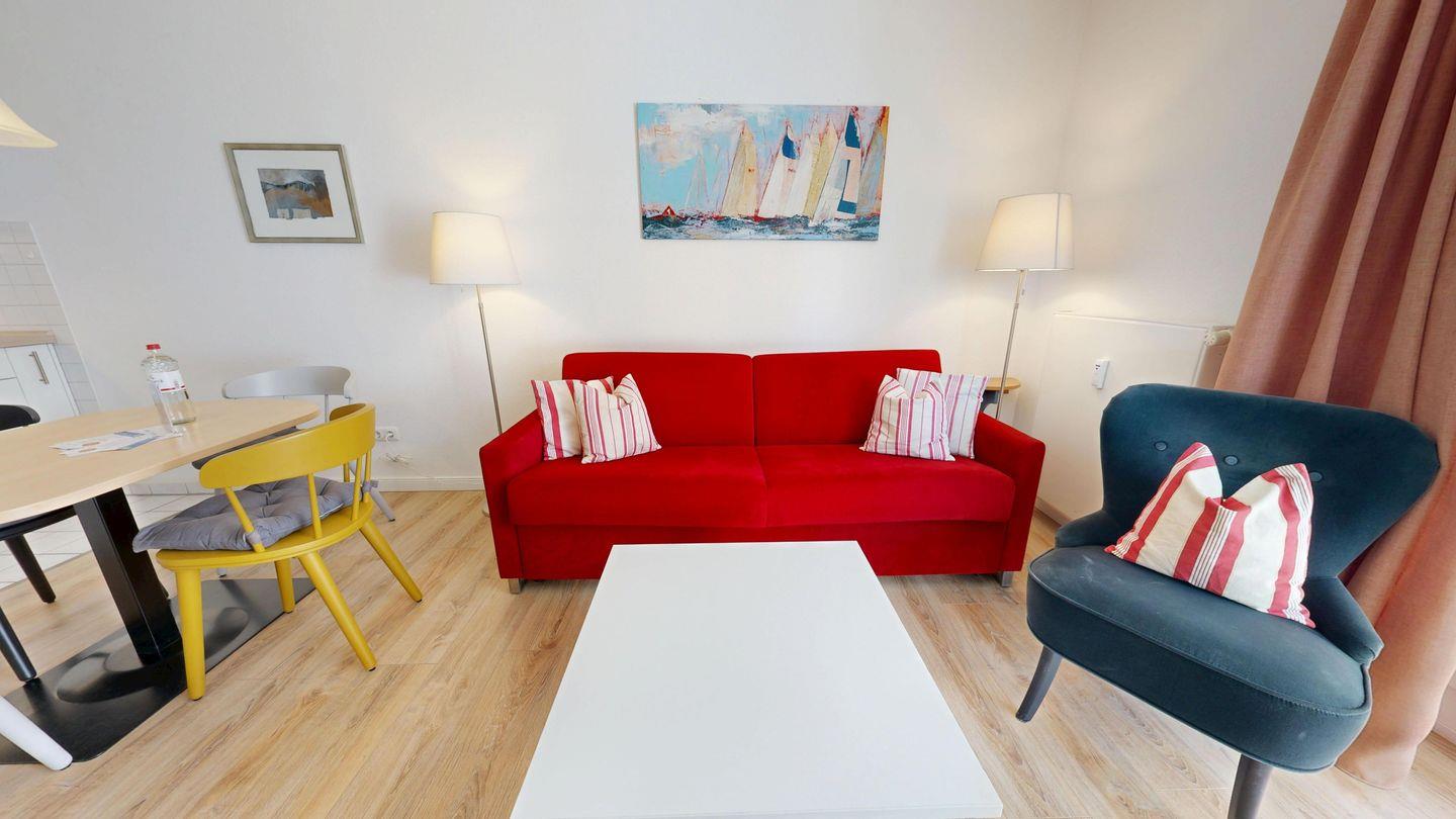 * Wohnzimmer: Couchgarnitur (Schlafgelegenheit für 2 Personen), Kabel-TV, Stereoanlage, Internetanschluss (WLAN), Esstisch